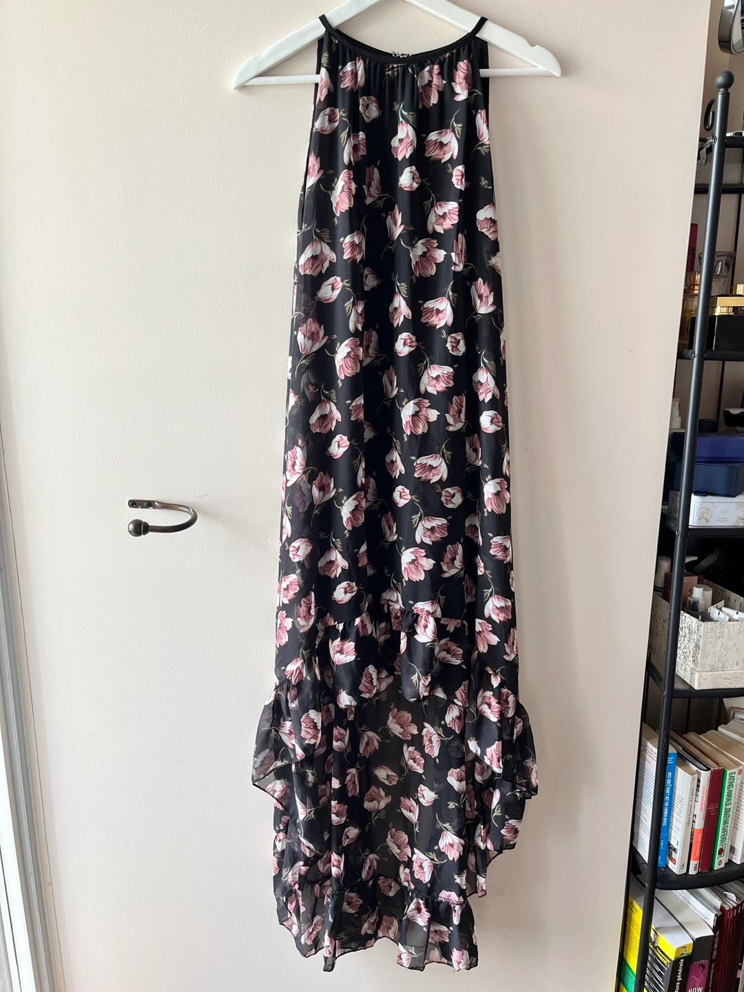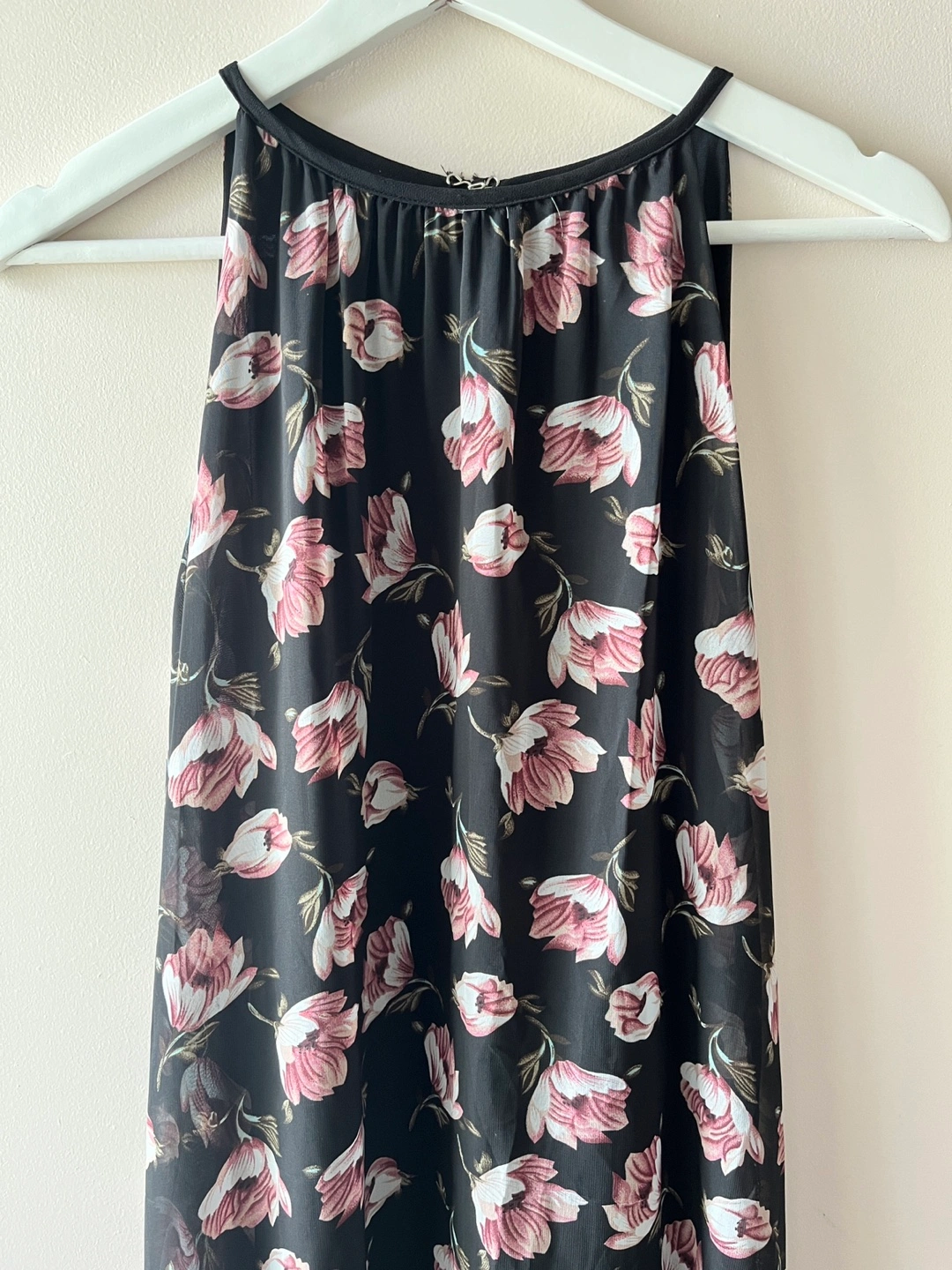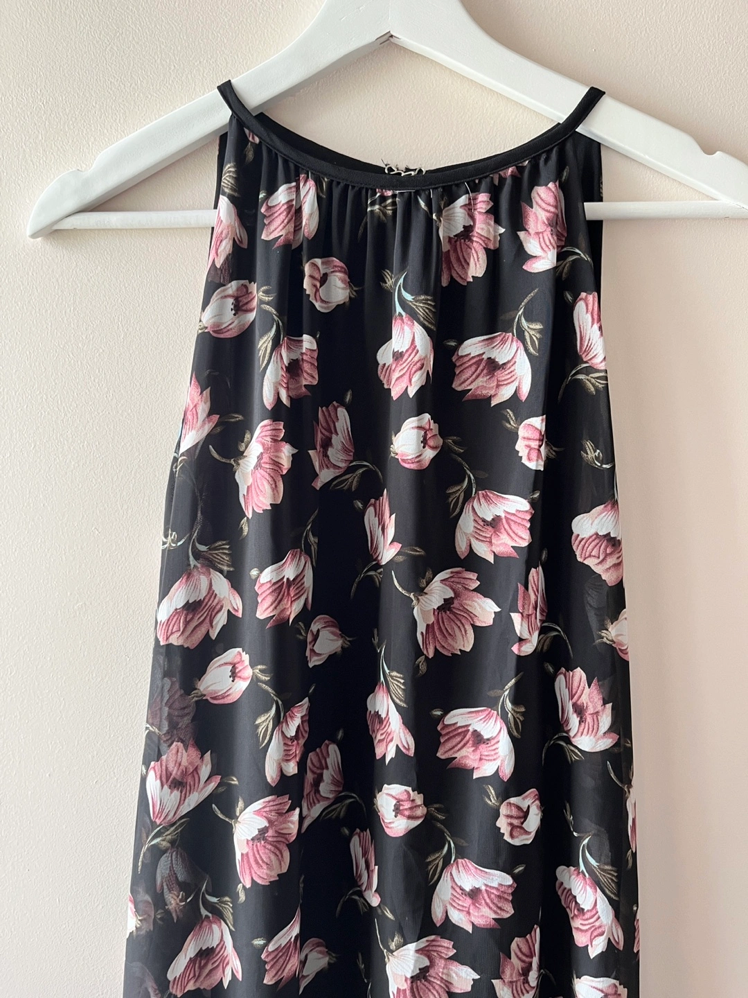Here's a lovely floral print maxi dress! It features a halter neckline and a flowing, layered hem. Perfect for a summer day or evening out. Worn once, in perfect condition.
