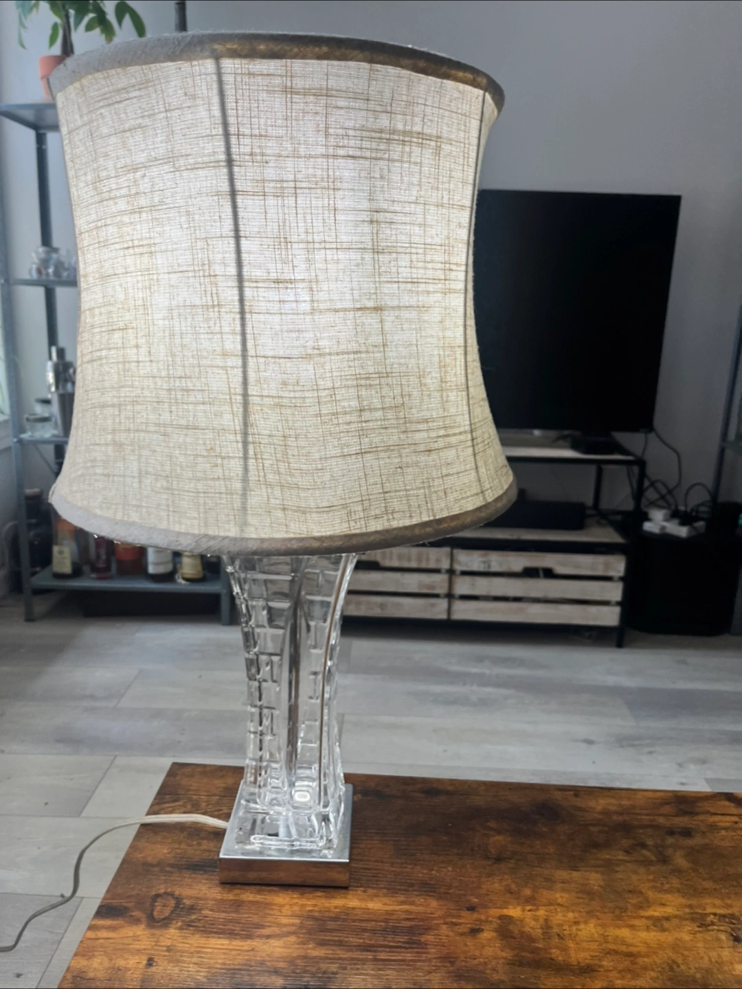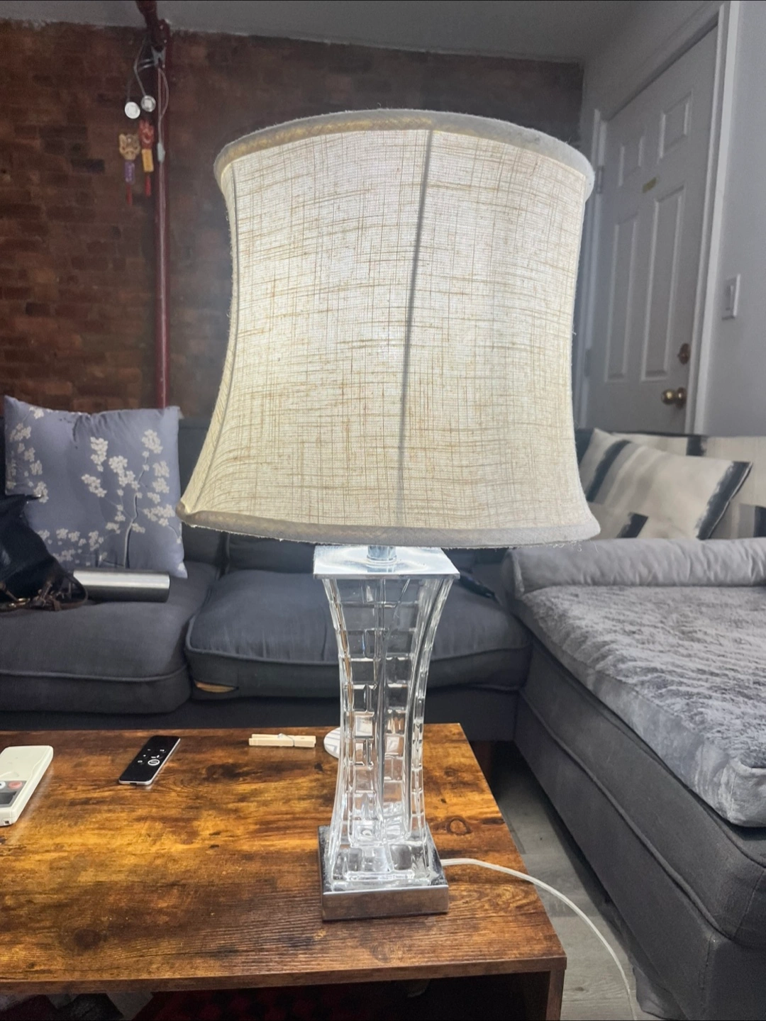 Selling a beautiful crystal table lamp! It features a clear crystal base and a neutral-colored fabric shade. It would look great in any living room or bedroom