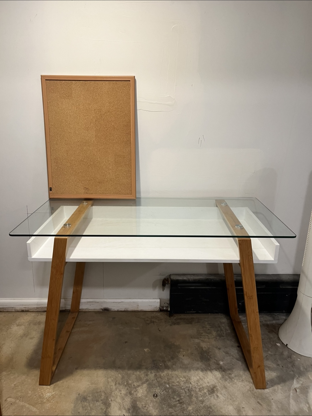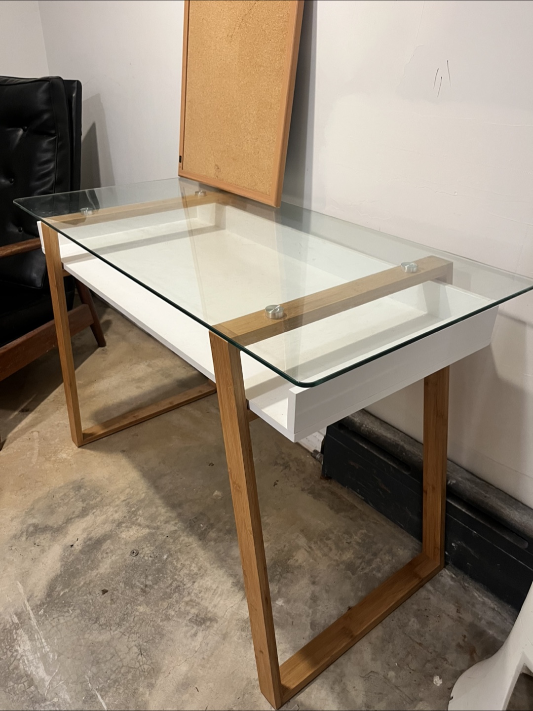 Selling a desk with a glass top and wooden legs. It's in good condition and would be a great addition to any home office or study space