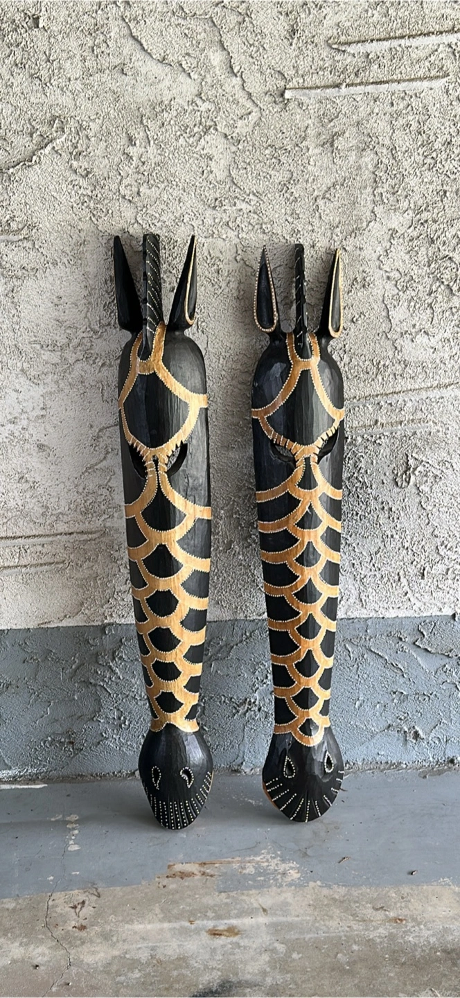 Selling a pair of hand-carved African giraffe masks. These striking pieces are perfect for adding a touch of global art to your home. They feature a black finish with gold detailing, creating a unique and eye-catching design. Great for wall decor or as part of a collection!