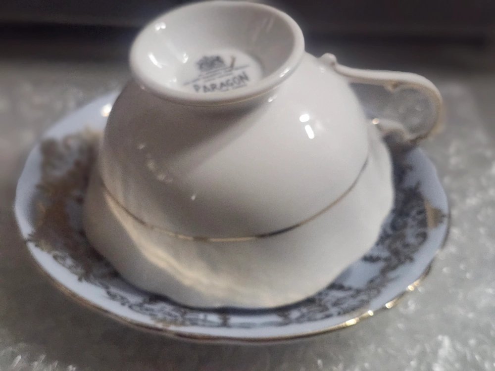 Selling a beautiful Paragon fine bone china teacup and saucer set. The cup features a lovely floral design and gold trim. Perfect for tea time or as a decorative piece!