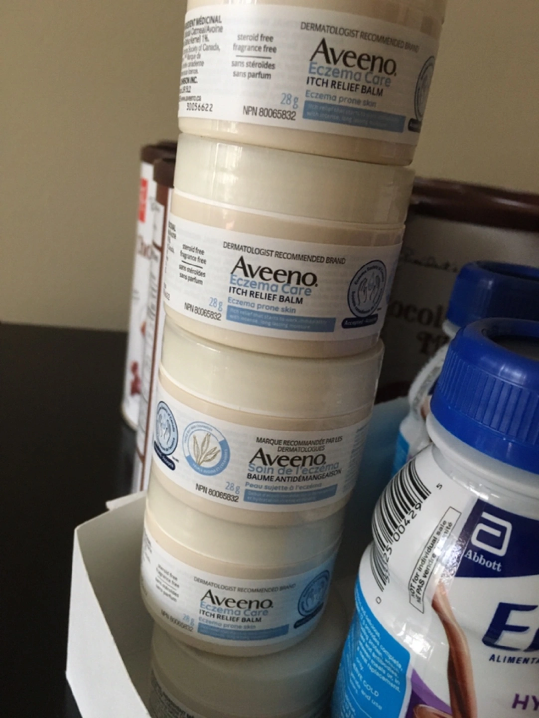 I have some Aveeno Eczema Care Itch Relief Balm available! This balm is dermatologist recommended and great for eczema-prone skin. It's steroid-free and fragrance-free, perfect for sensitive skin. Each container has 28g of product