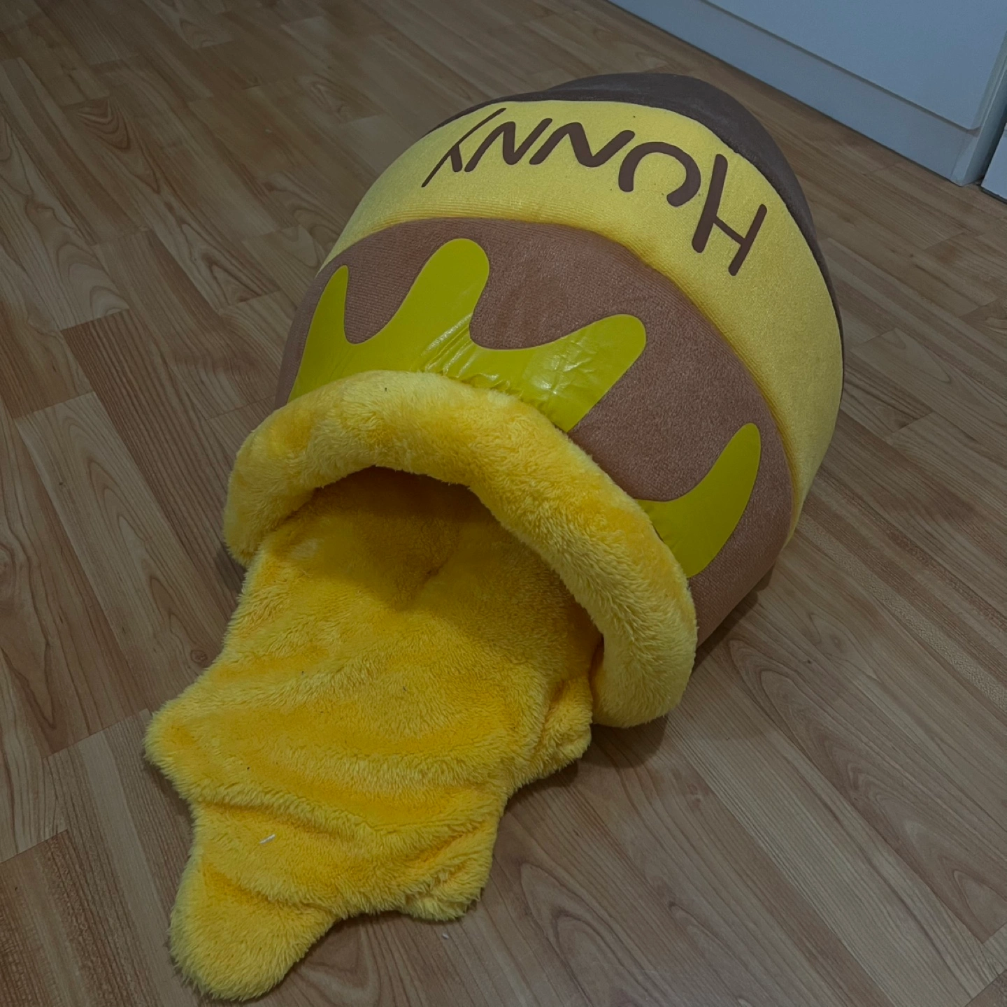 Super cute honey pot themed pet bed! It's shaped like a honey pot and has a cozy yellow interior for your furry friend to snuggle in. The outside says 'HUNNY' in big letters, so everyone knows who it belongs to