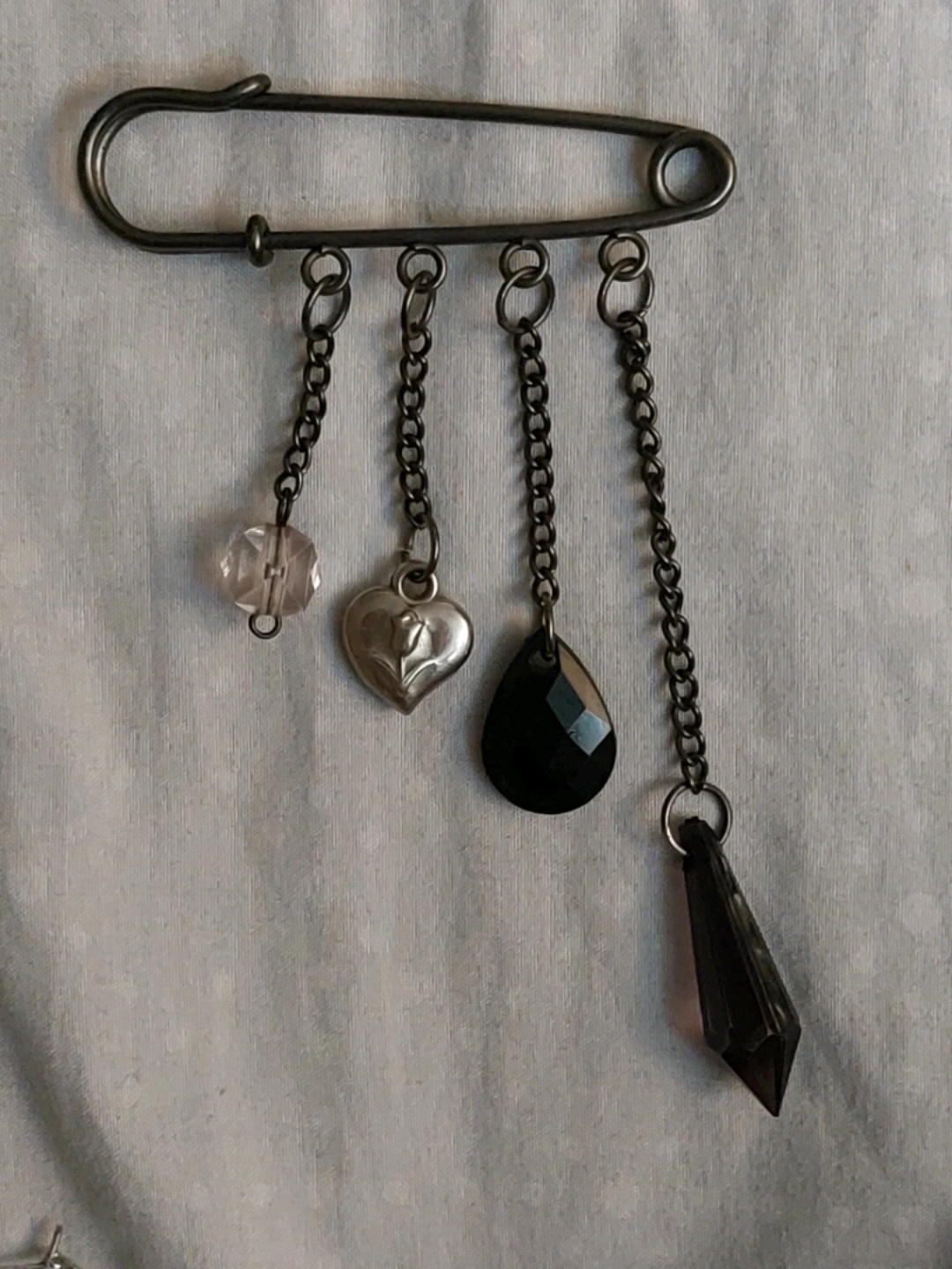 Here's a safety pin brooch with dangling charms! It features a large safety pin with chains of varying lengths. The charms include a clear bead, a silver heart, a black teardrop, and a dark geometric shape. It's a unique piece to add some flair to your outfit