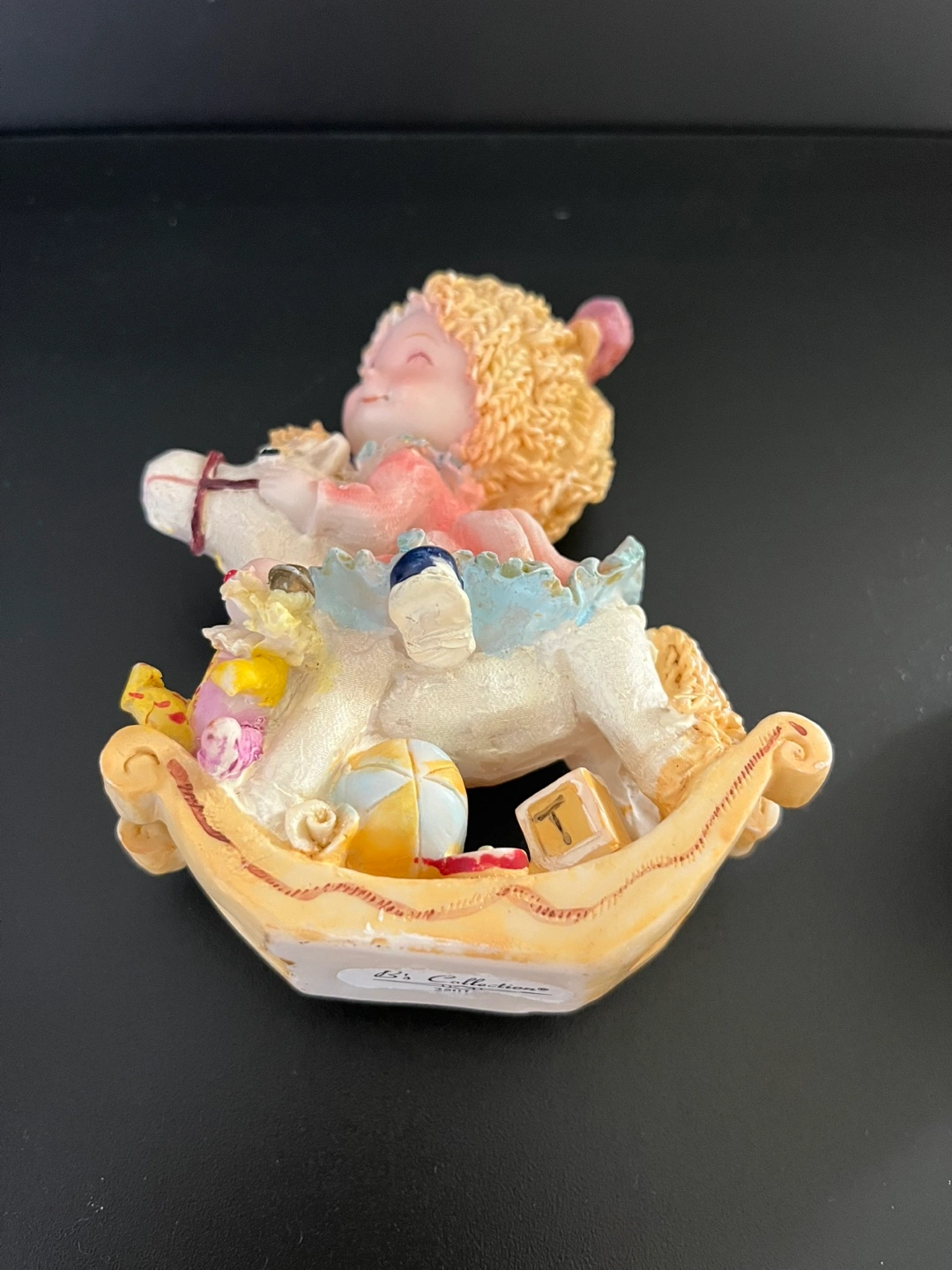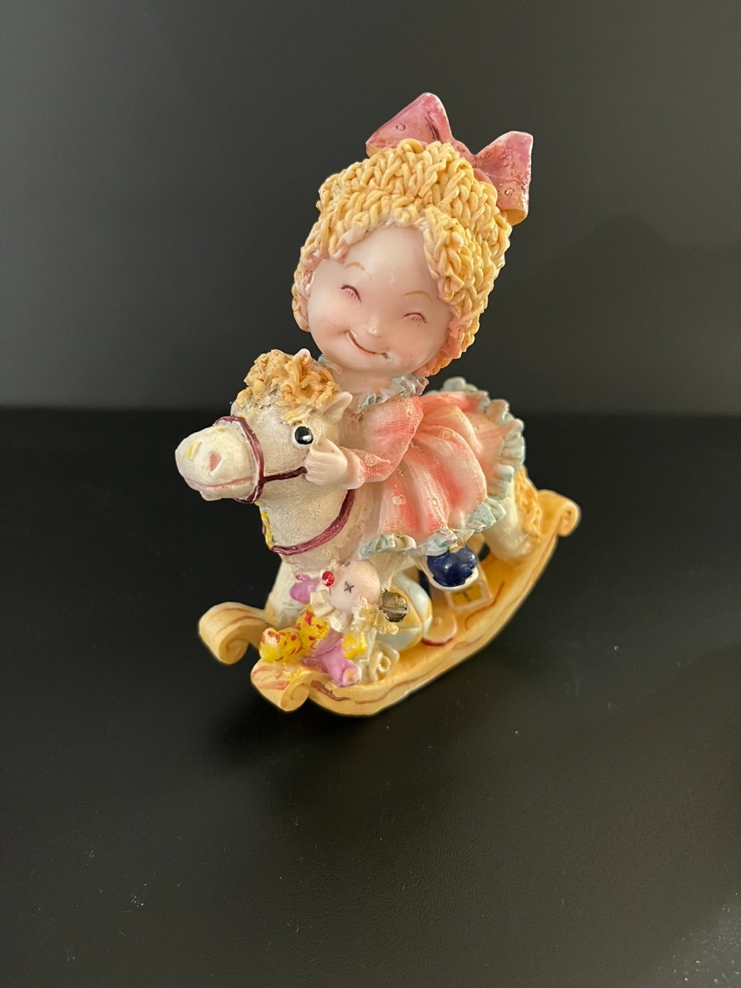 This is a charming figurine from B's Collection featuring a girl riding a rocking horse. It's a sweet and decorative piece that would look lovely on a shelf or desk or as addition to a doll house! It is in great condition!