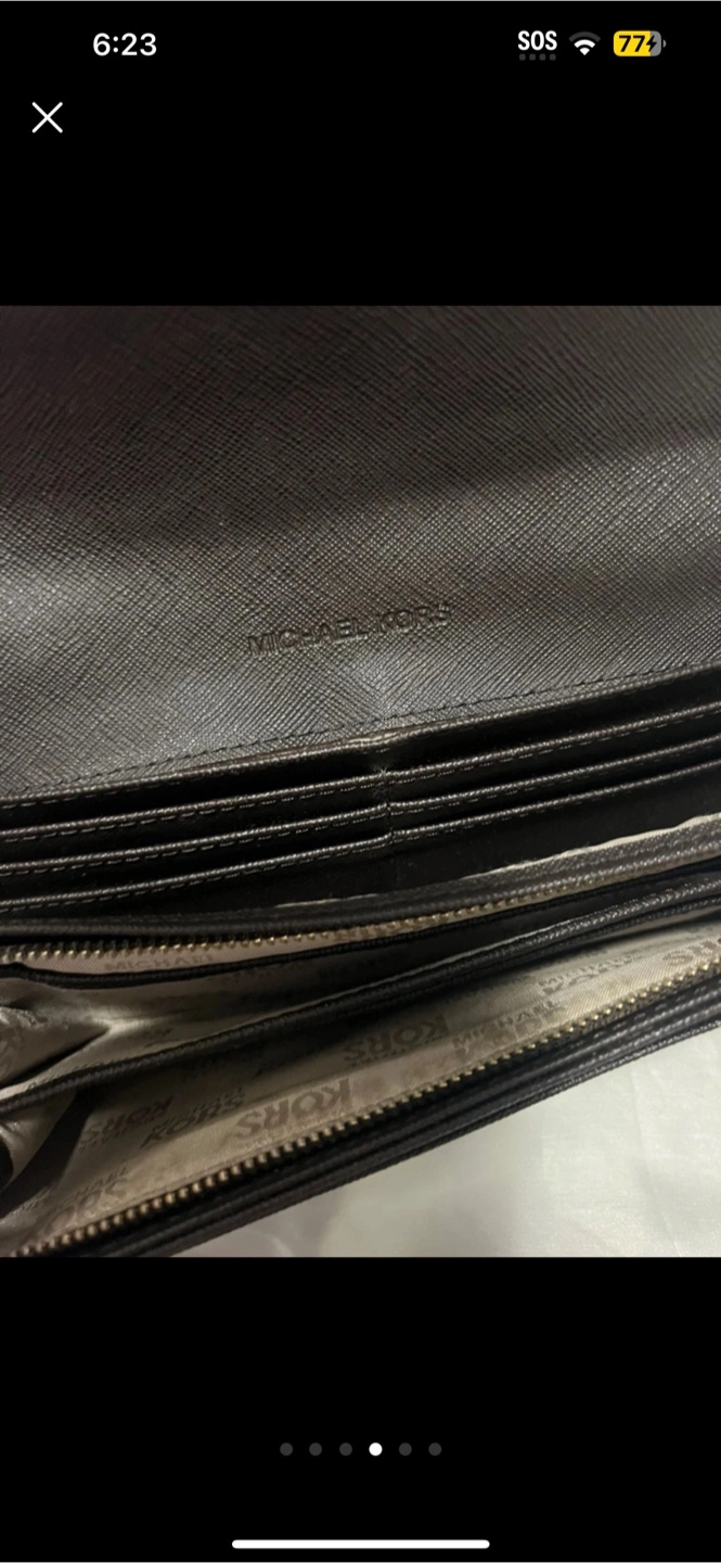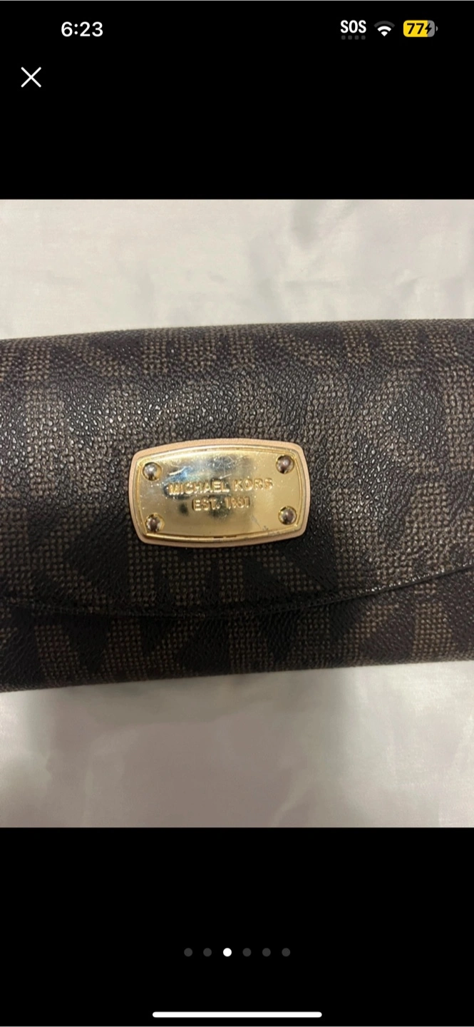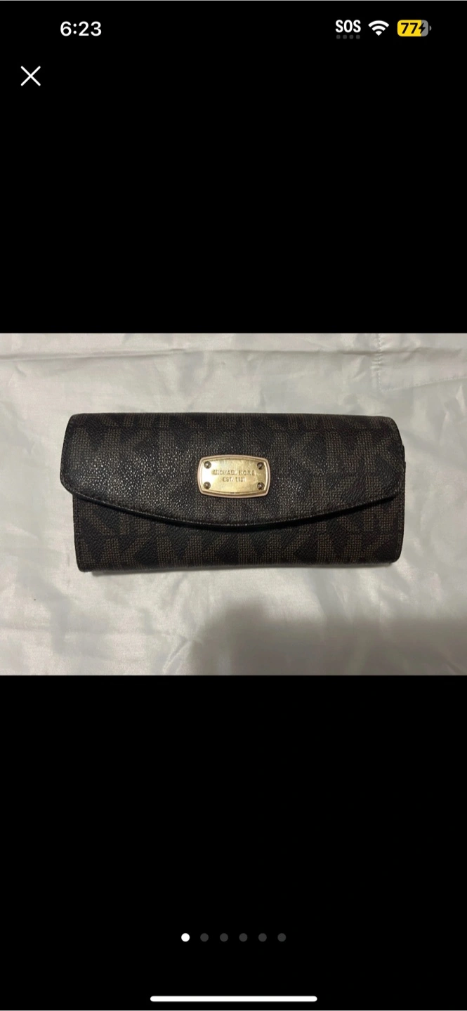 I'm selling a gently used Michael Kors wallet in brown. It has the classic MK logo pattern. It's in good condition and ready for a new home!
