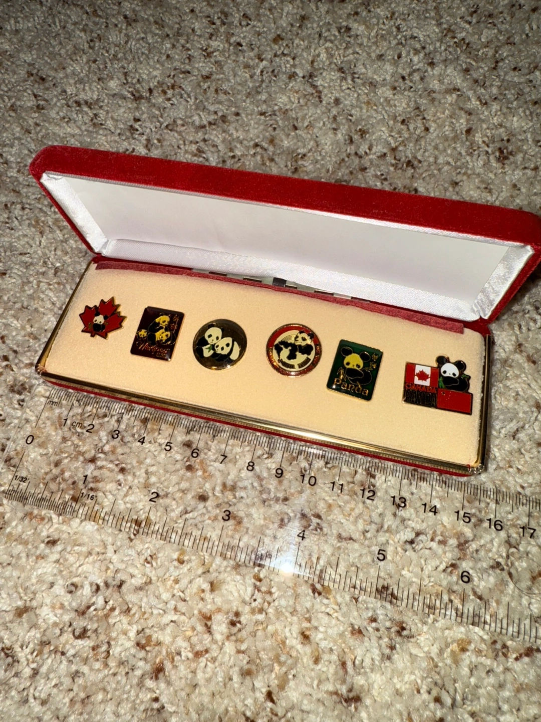 Here's a cute set of pins featuring pandas. They come in a red presentation box, perfect for collectors or anyone who loves pandas and Canada.