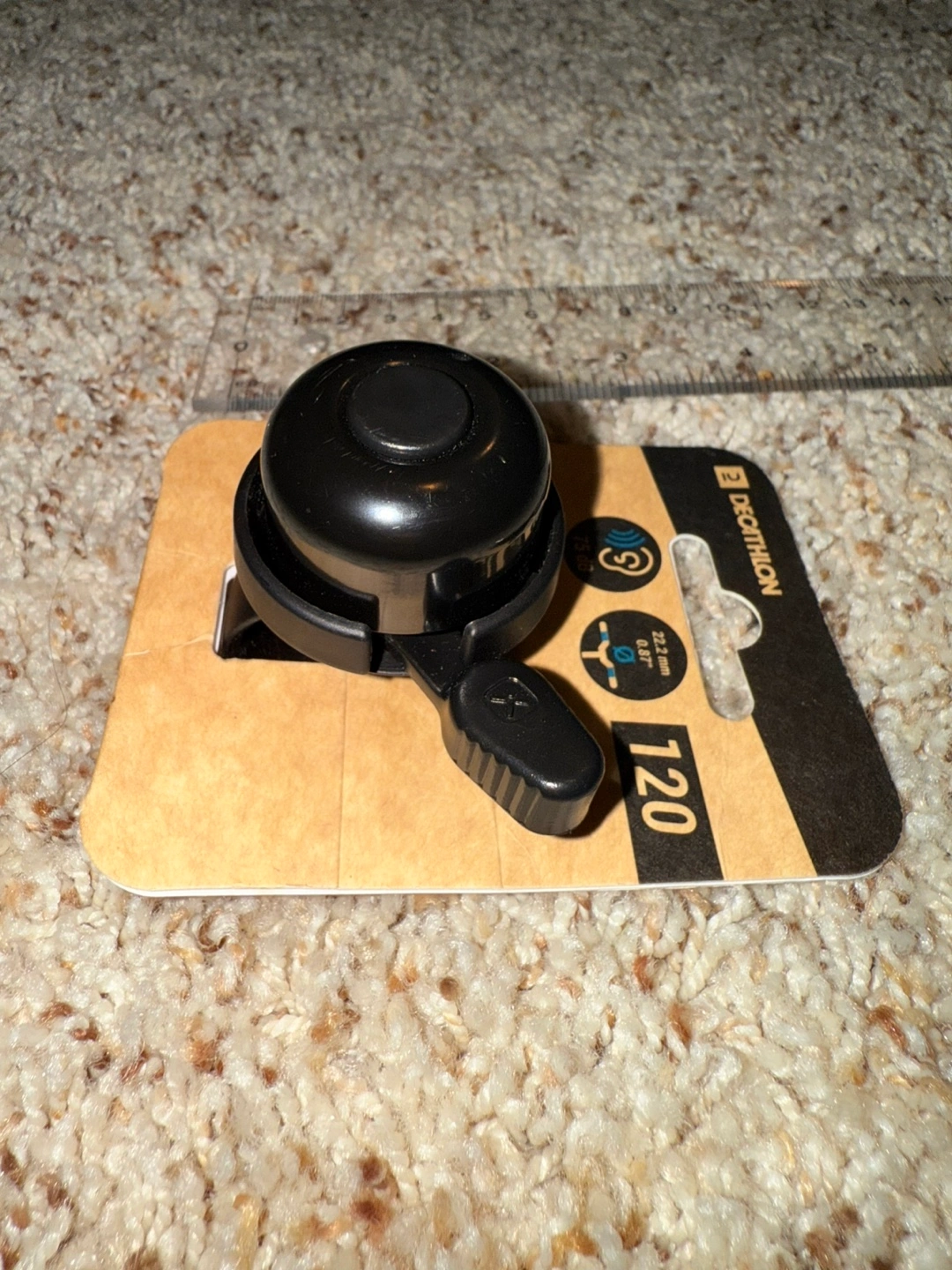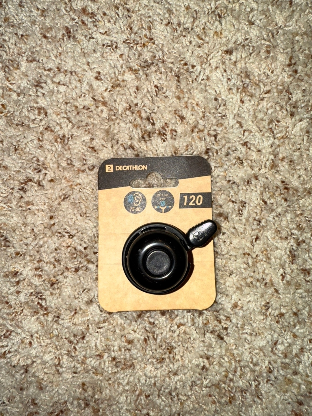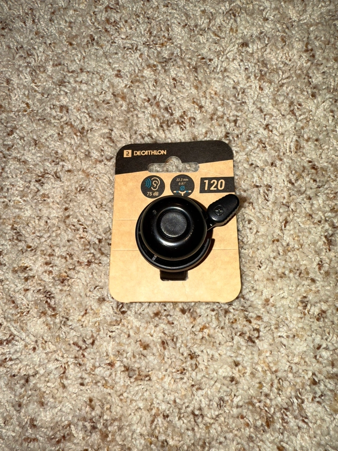 Selling a brand new Decathlon 120 bike bell! It's still in its original packaging. The bell is black and produces a 75 dB sound.
