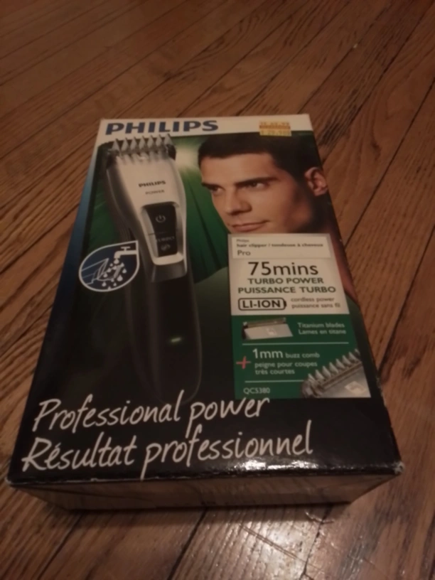 Selling a Philips Turbo Power hair clipper, model QC5390! It comes with the box and all included components, like the charger and instructions. It also features titanium blades and a 1mm buzz comb for precise cuts. Great for professional power at home!