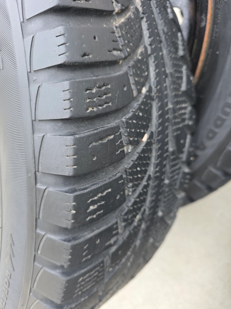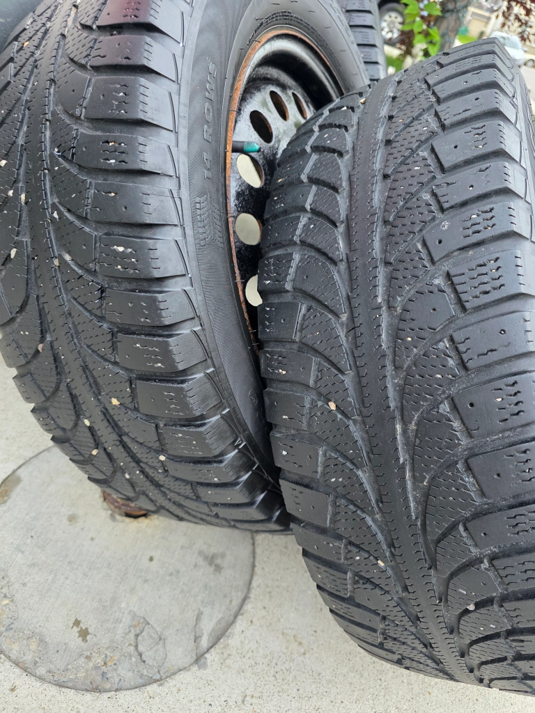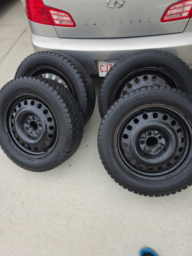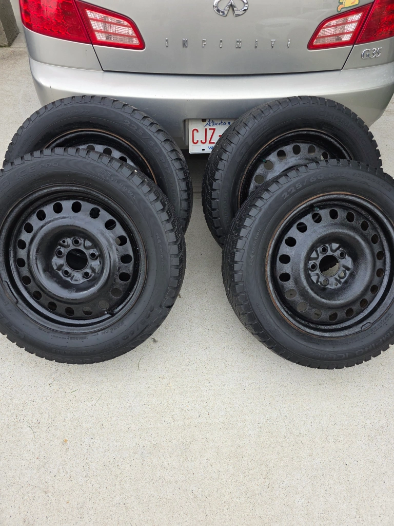 Selling a set of four winter tires, size 225/60R17. They're mounted on black steel rims and ready to go for the winter season. The tires have the M+S (Mud and Snow) rating, making them suitable for winter conditions