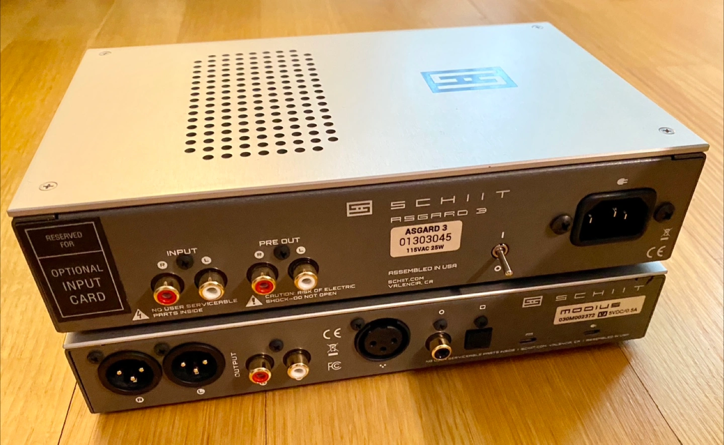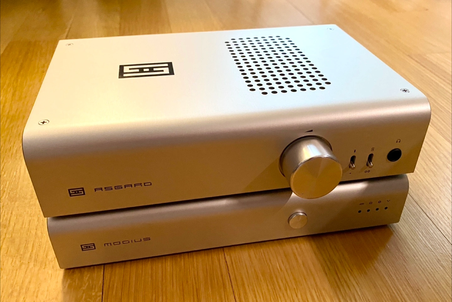 This is a “Schiit Stack” as they say. It’s a Schiit Asgard 3 headphone amplifier and a Schiit Modius DAC.