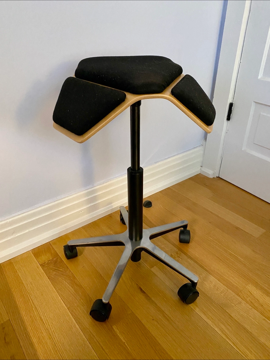 Adjustable height ergonomic saddle stool. Pretty comfortable once you get used to it and is nice to have especially if you use a standing desk.