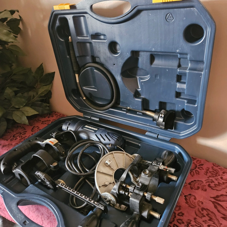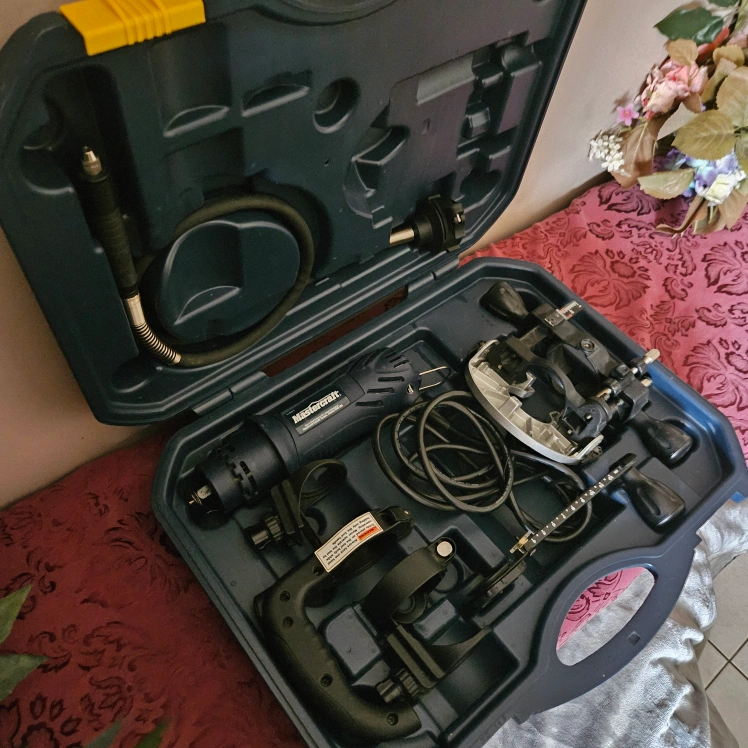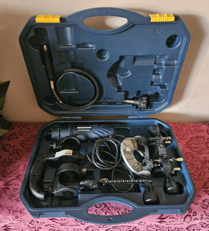This kit includes a spin saw and various attachments and accessories for cutting, sanding, grinding, and polishing in its own carry case.