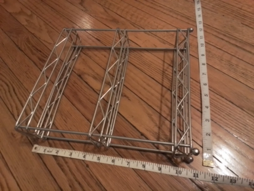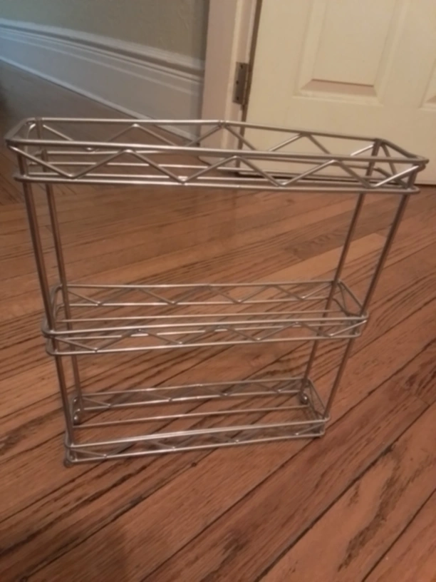 Here's a handy silver metal spice rack in great shape and ready to organize your spices or other small items. It measures approximately 11 inches tall and 9.5 nches wide, making it a compact storage solution for your kitchen or pantry