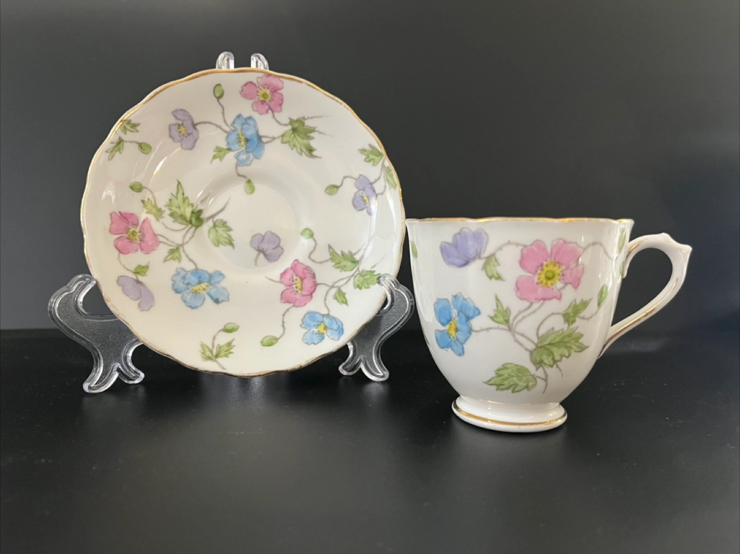 Selling a lovely Plant Tuscan China teacup and saucer set! The set features a delicate floral pattern with pink, blue, and purple flowers. It's in great condition and would be a charming addition to any tea collection