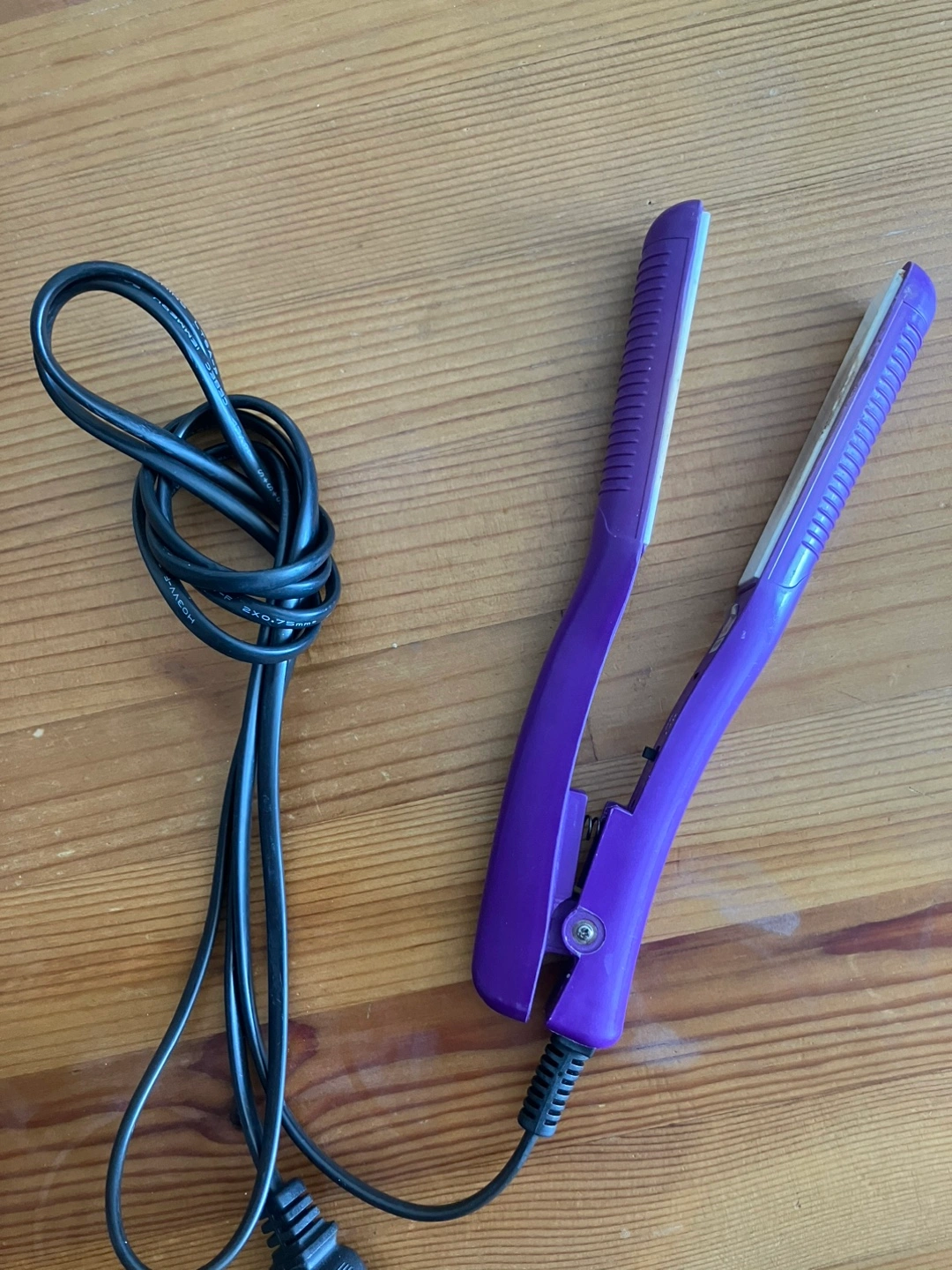 Selling a purple hair straightener in used condition. It's perfect for quick touch-ups or styling your hair. It has some signs of use on the plates, but it still works great!