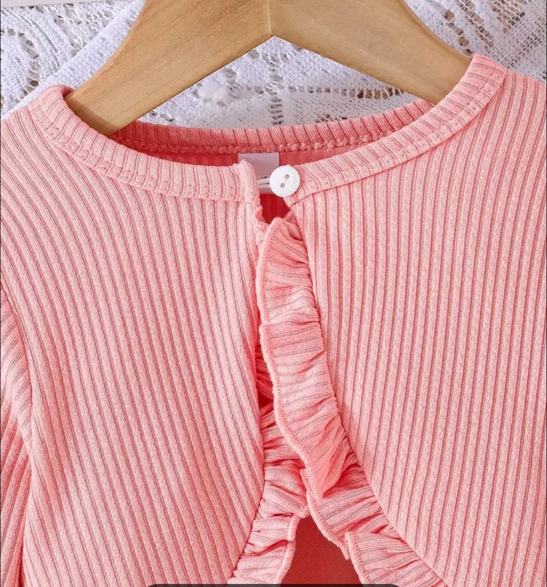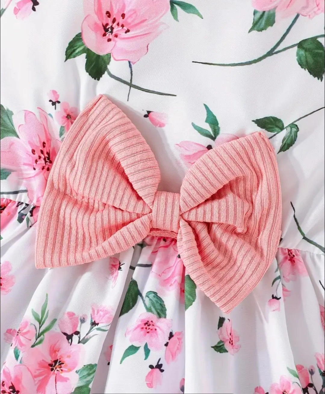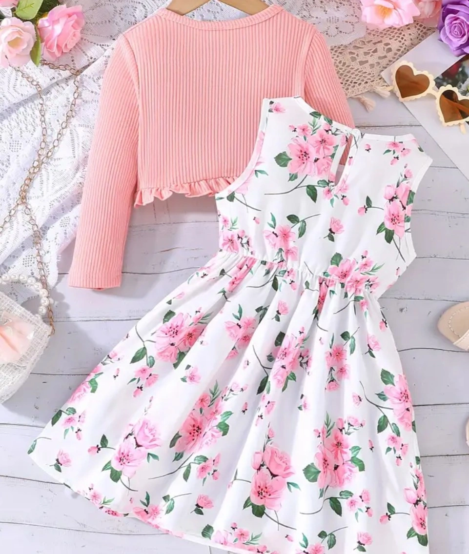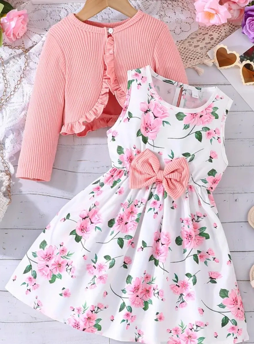 A cute floral dress with a matching cardigan! The dress has a pink floral pattern and a sweet bow, while the cardigan is a solid pink with a ruffled edge. Perfect for your little one!
