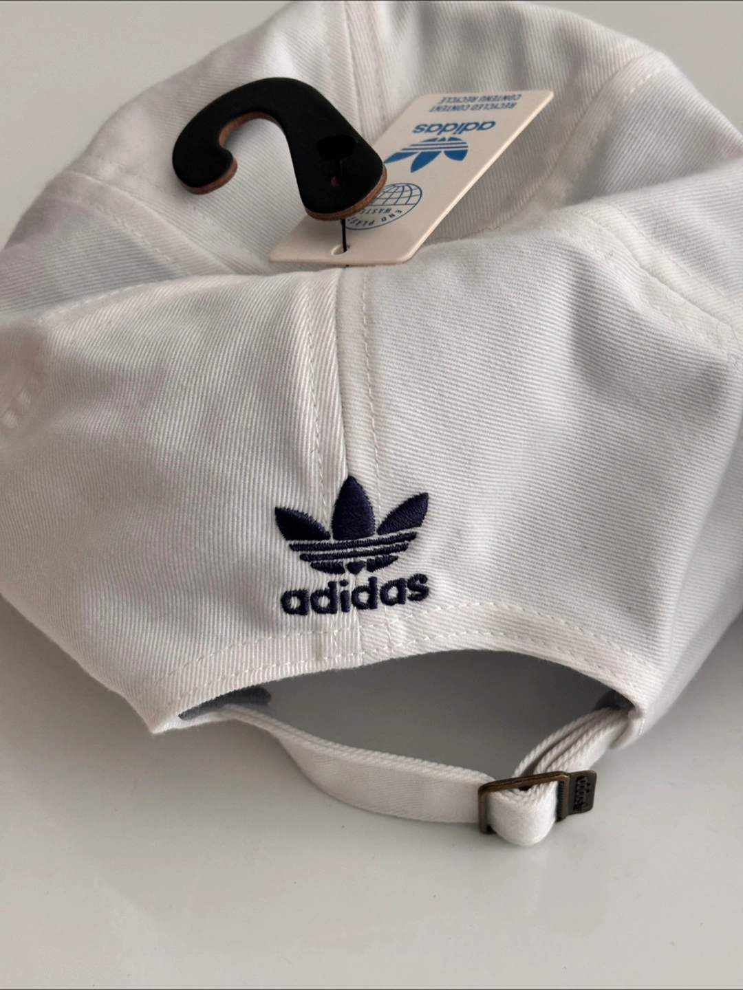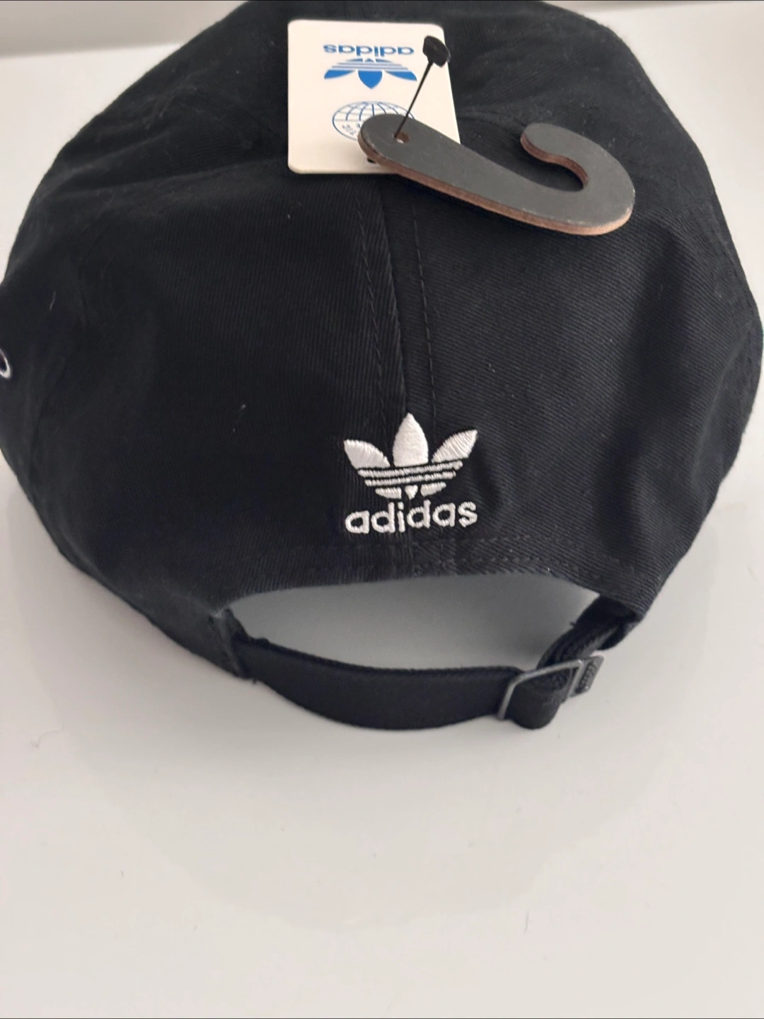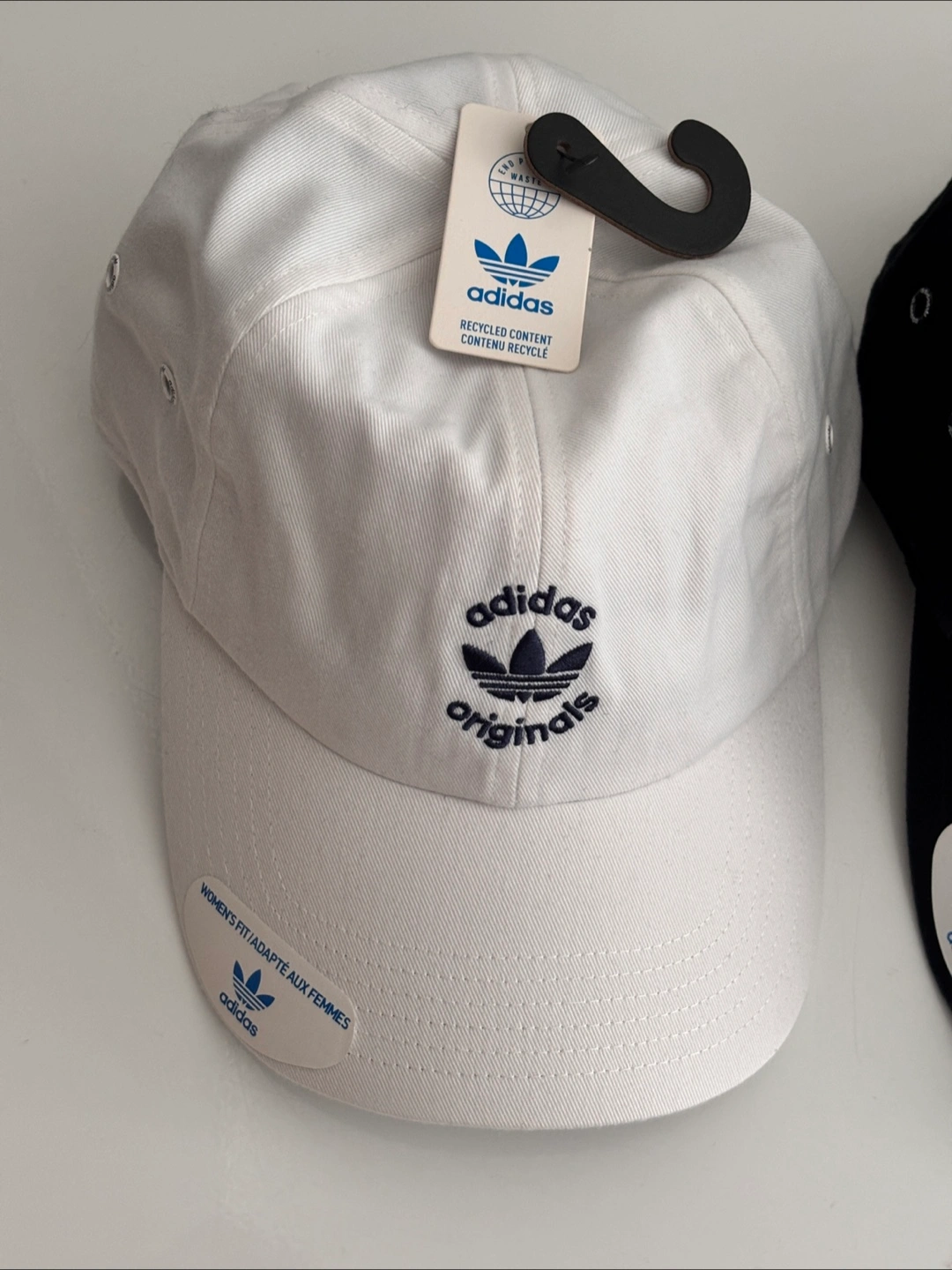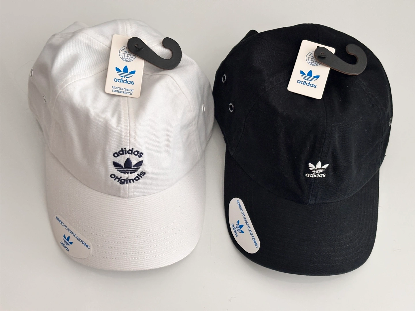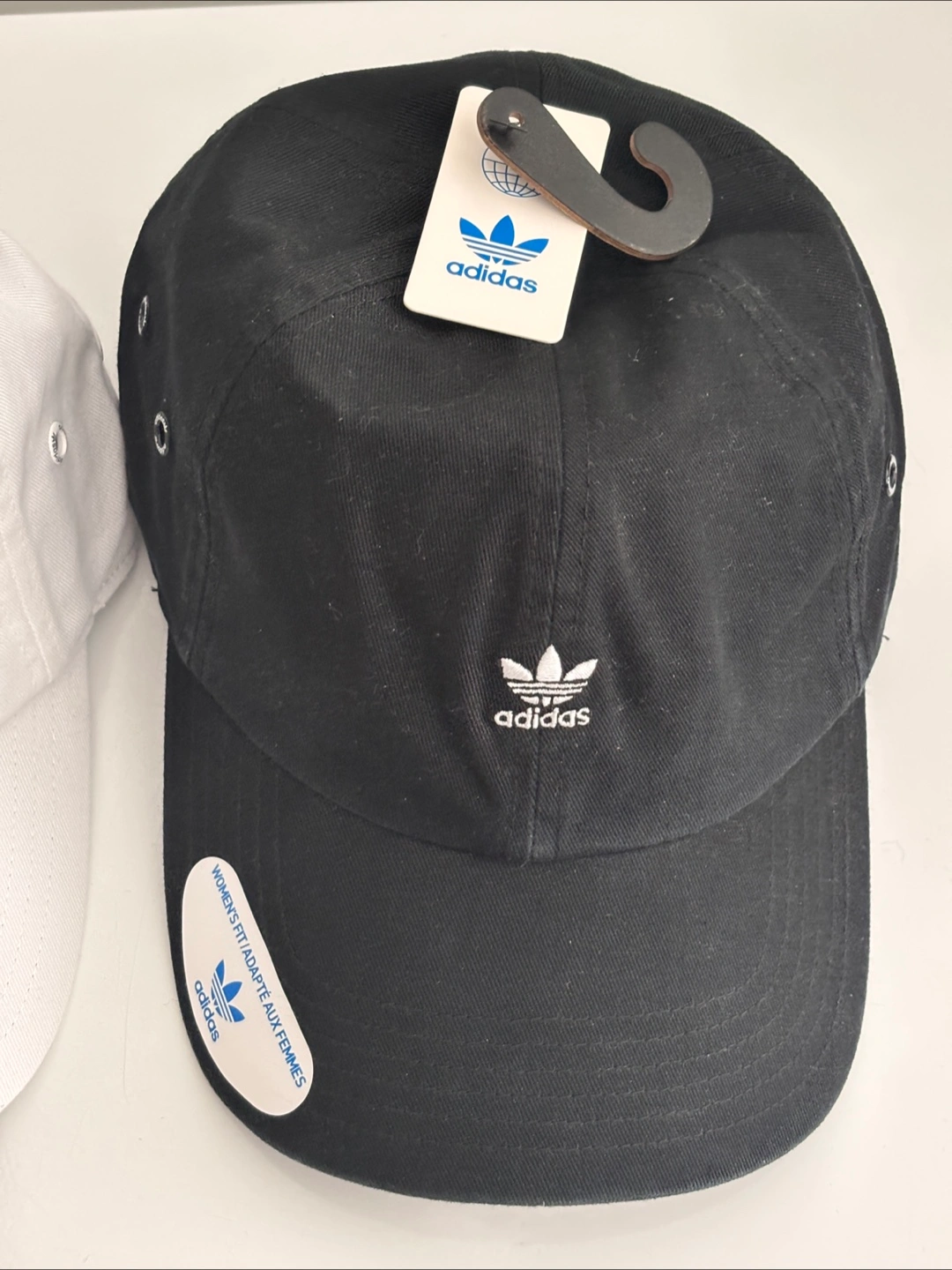 Two Adidas relaxed caps with mini logos. One is black and the other is white. Both are brand new. Perfect for adding a sporty touch to your everyday look!