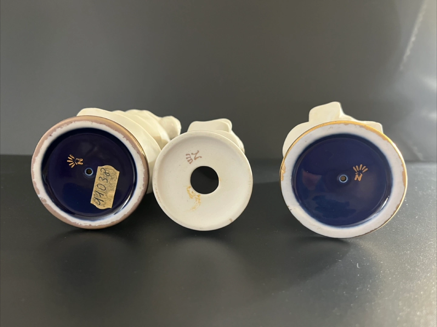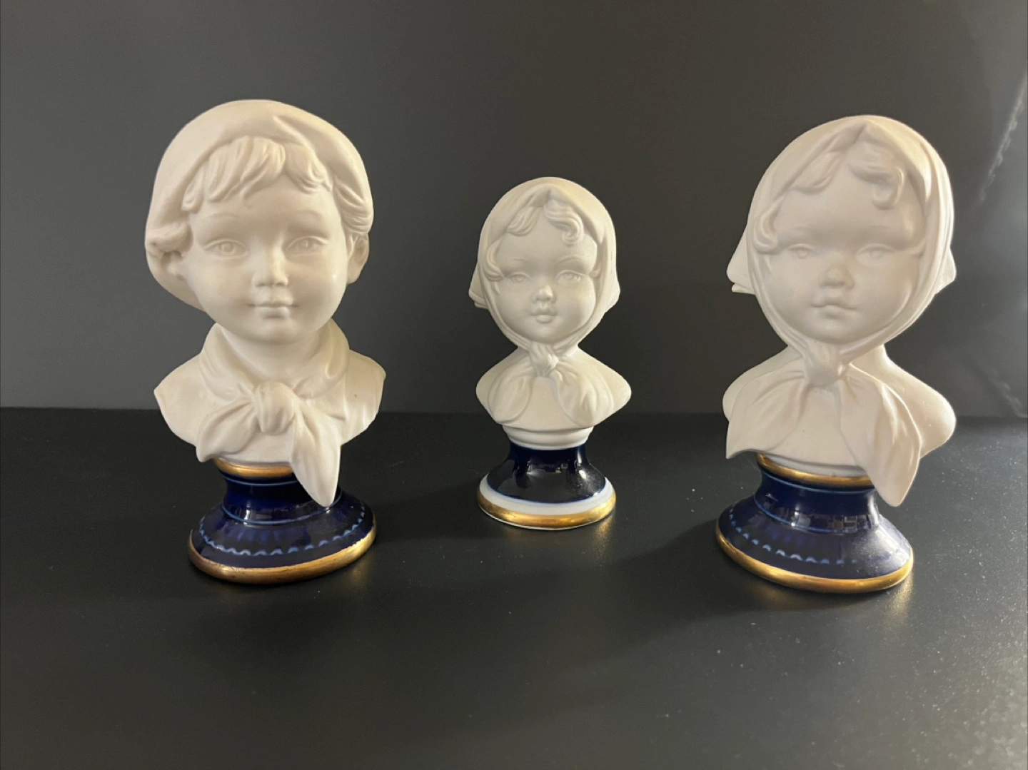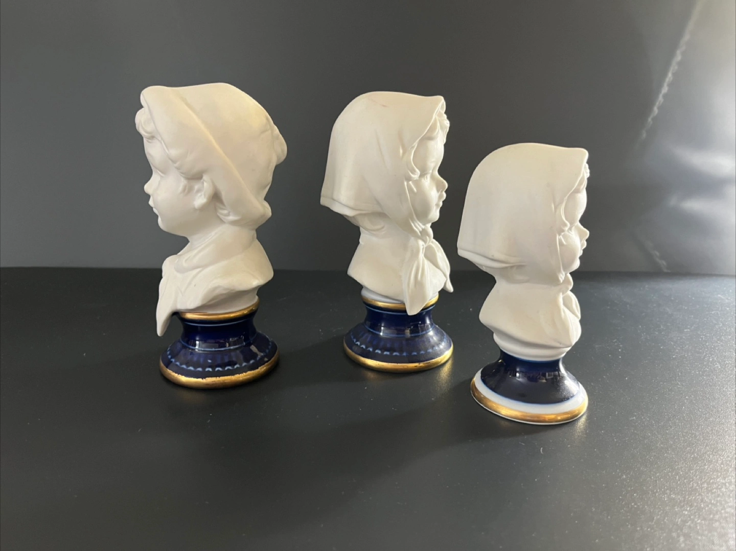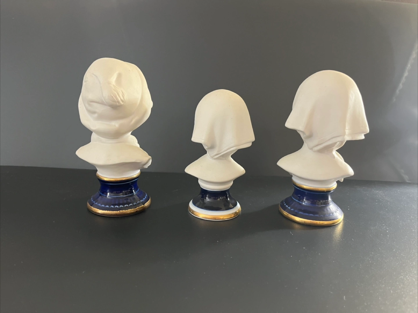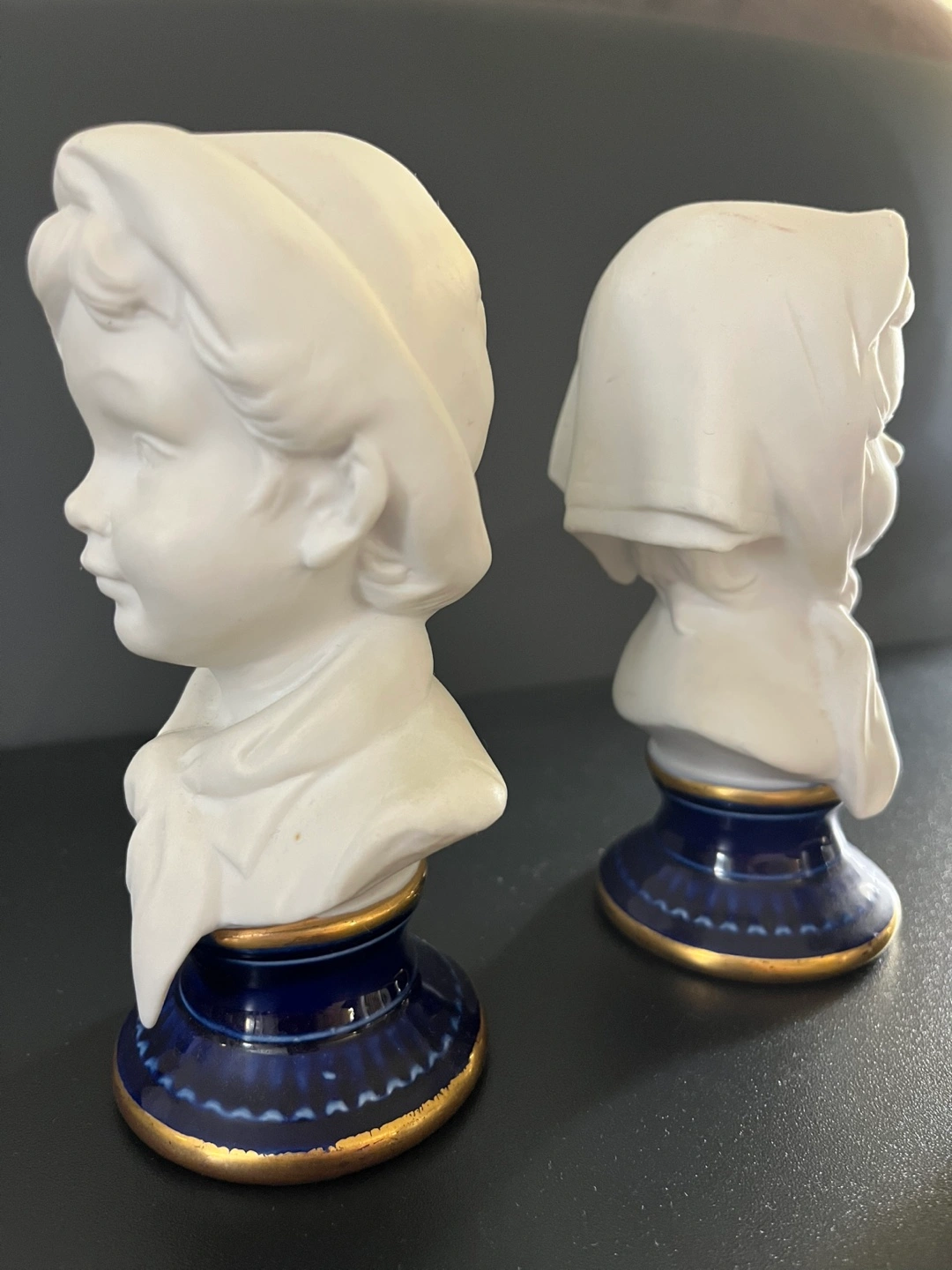 Selling a set of vintage ceramic bust figurines. They feature a white bust on a blue and gold base. They would make a lovely addition to your home decor.
