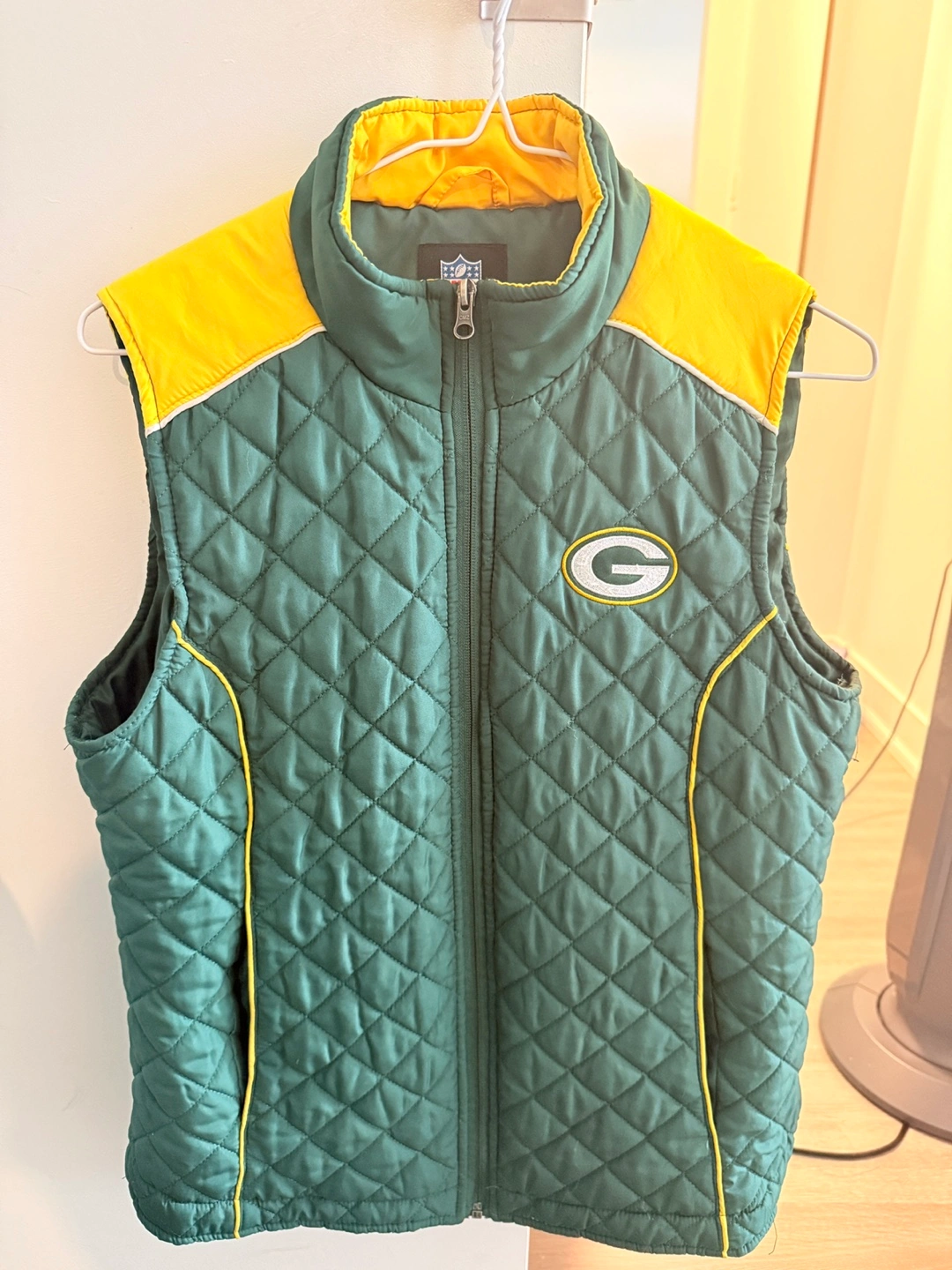 Selling a Green Bay Packers vest. It's green and yellow with the Packers logo on the front and 'Packers' written on the back. Perfect for showing your team spirit!
