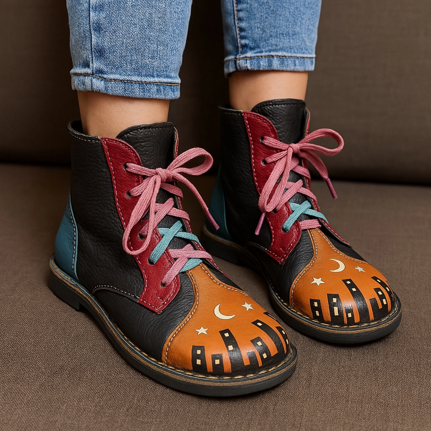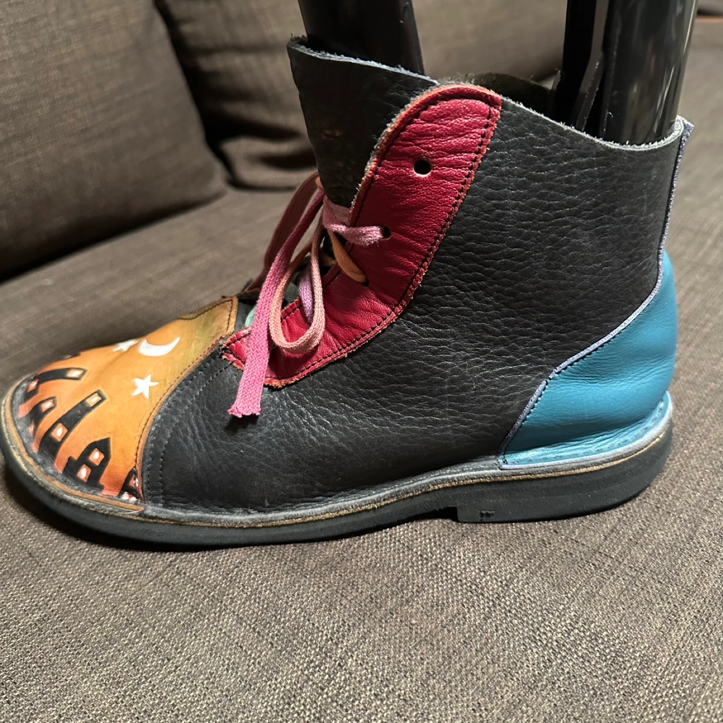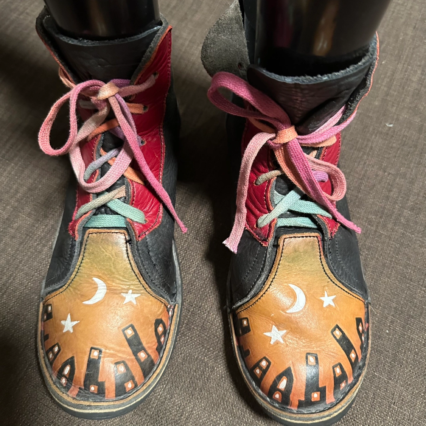 These are a pair of Go Mad leather ankle boots with a unique design! They feature a mix of colours including black, red, and blue, with a cityscape design on the toe. Perfect for adding a bit of fun to your wardrobe! Size 8-8.5