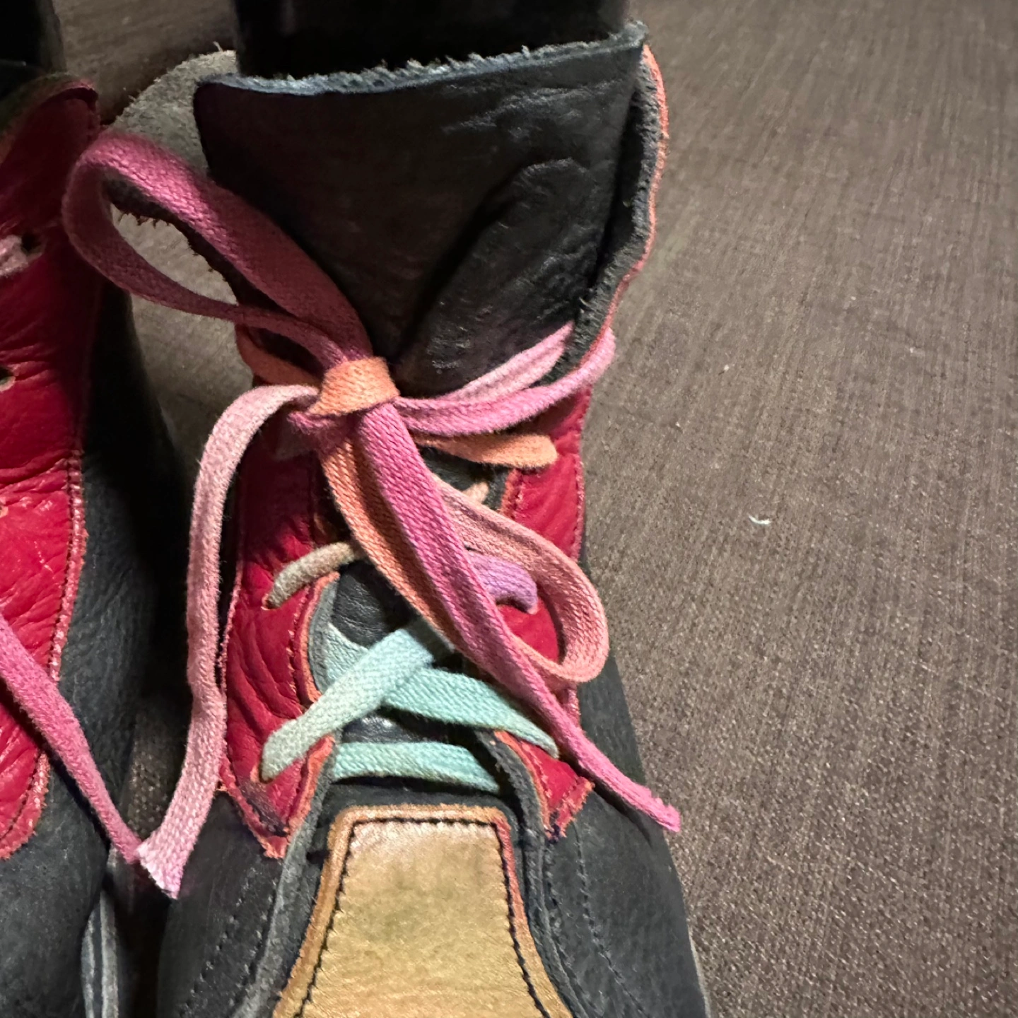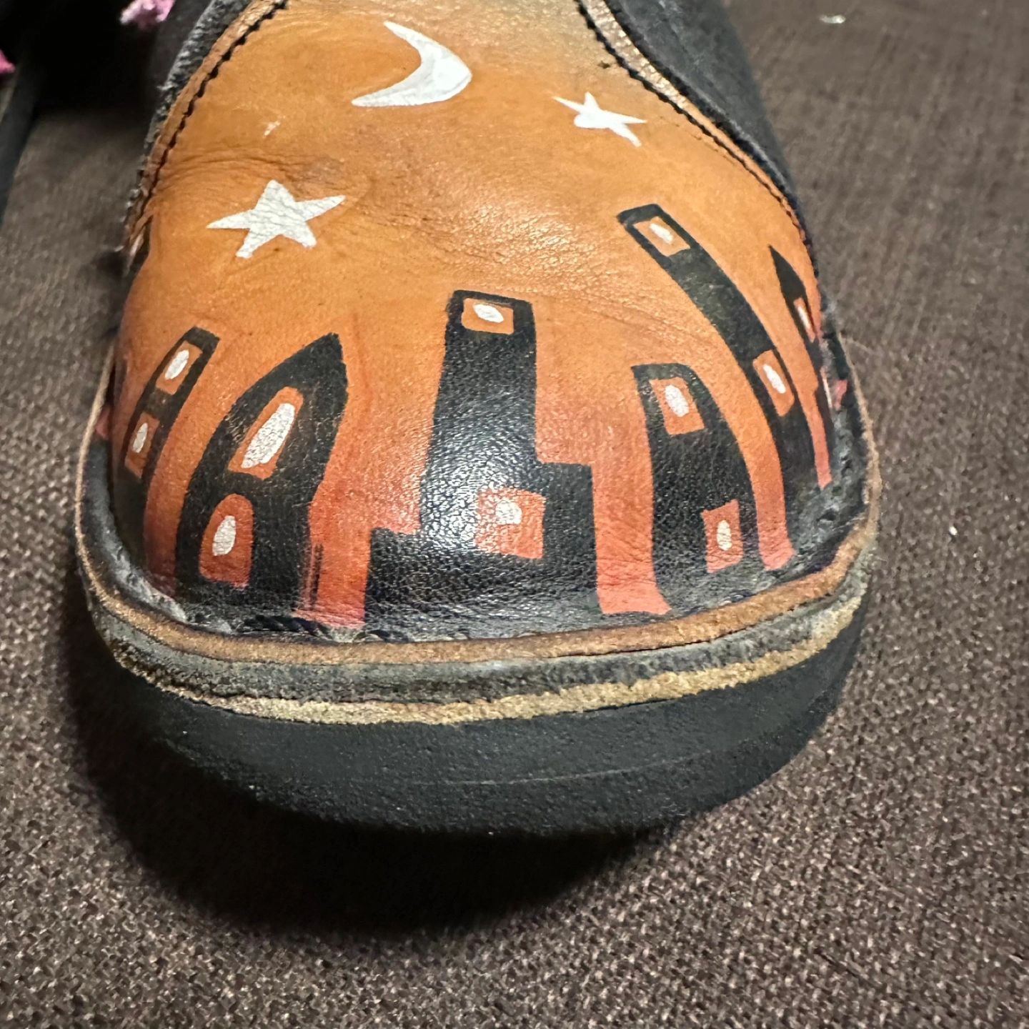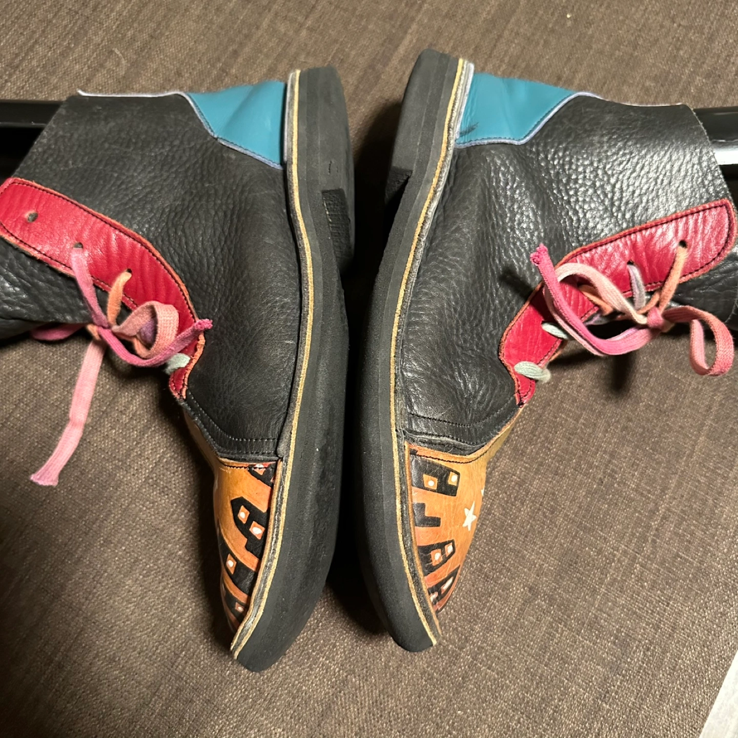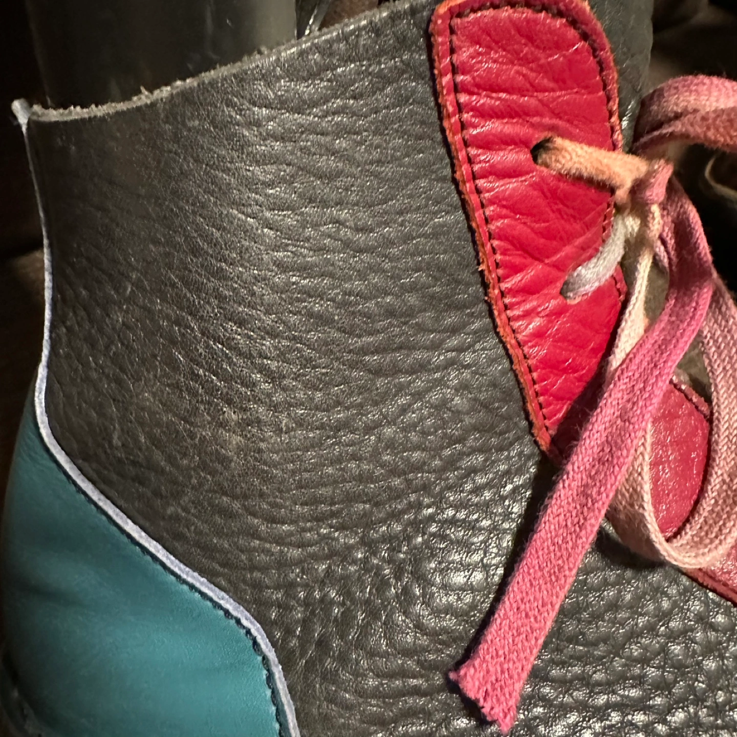 These are a pair of Go Mad leather ankle boots with a unique design! They feature a mix of colours including black, red, and blue, with a cityscape design on the toe. Perfect for adding a bit of fun to your wardrobe! Size 8-8.5