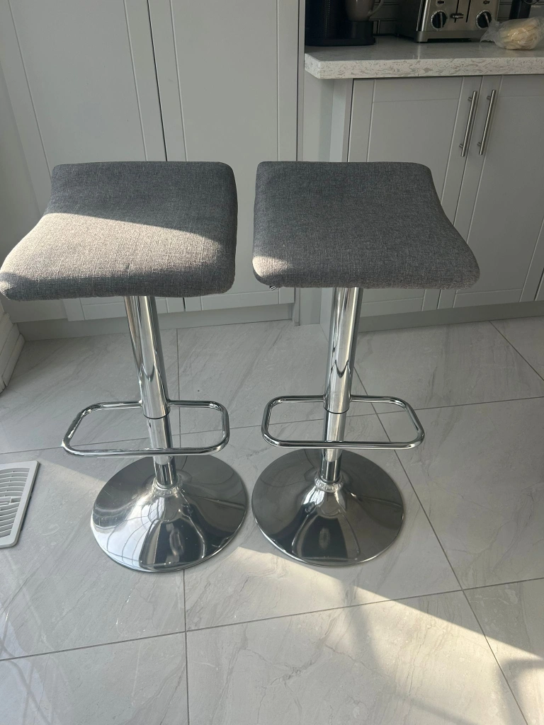 Selling a set of two bar stools with adjustable height. They feature a grey fabric seat and a chrome base. These are perfect for adding a modern touch to your kitchen or bar area! They're in great shape and ready for a new home