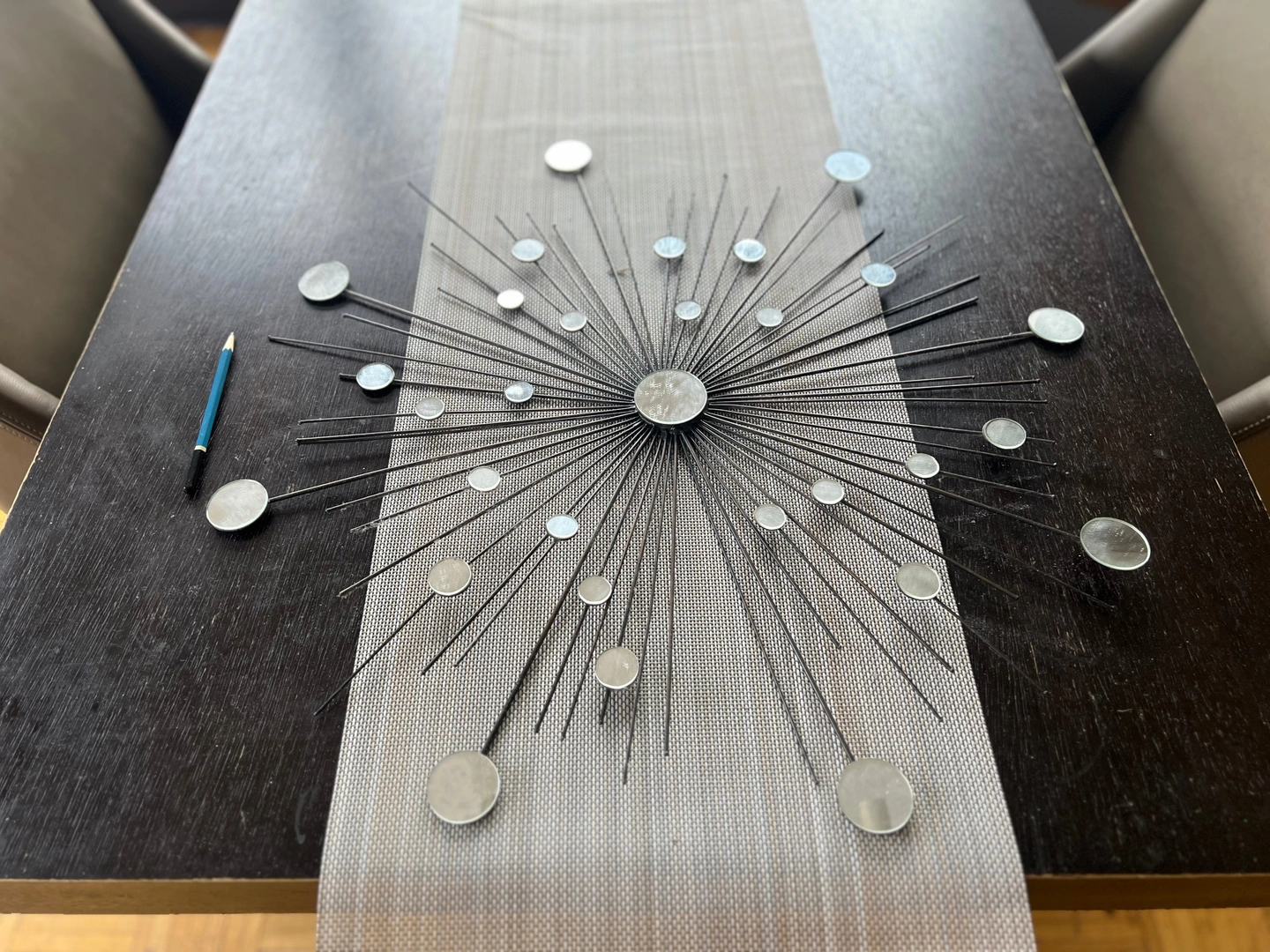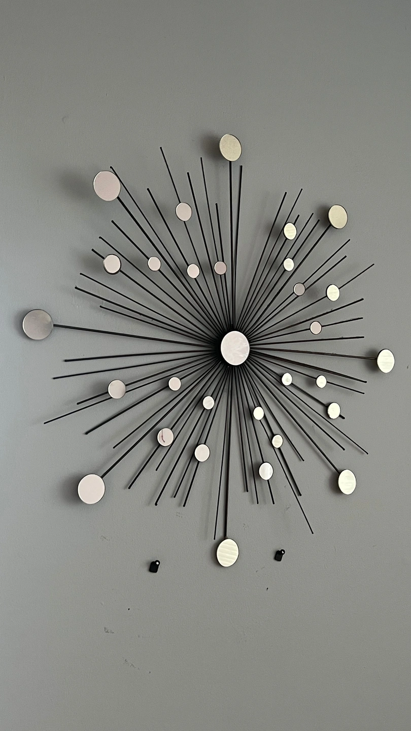 Sunburst wire wall art, handmade from stainless steel with mirror discs, 24 inches