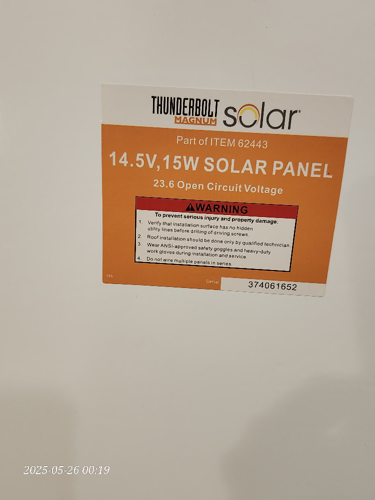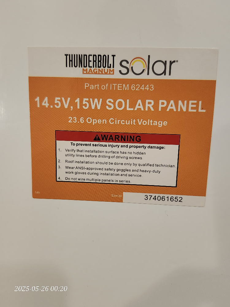 New Thunderbolt Solar Magnum 14.5V, 15W solar panel. It has a 23.6 Open Circuit Voltage. The part number is ITEM 62443. Comes with the original box