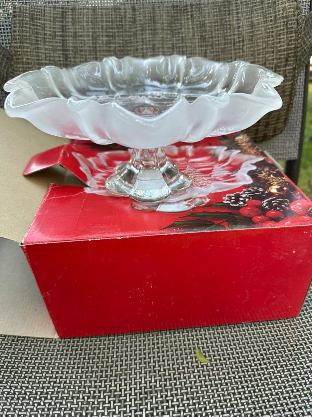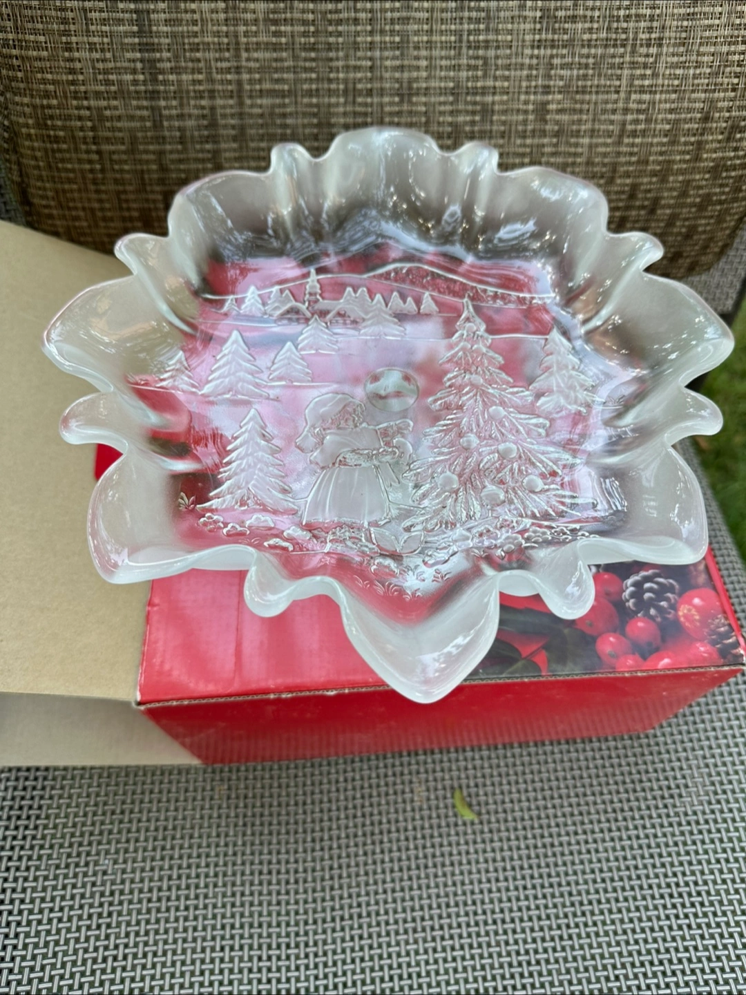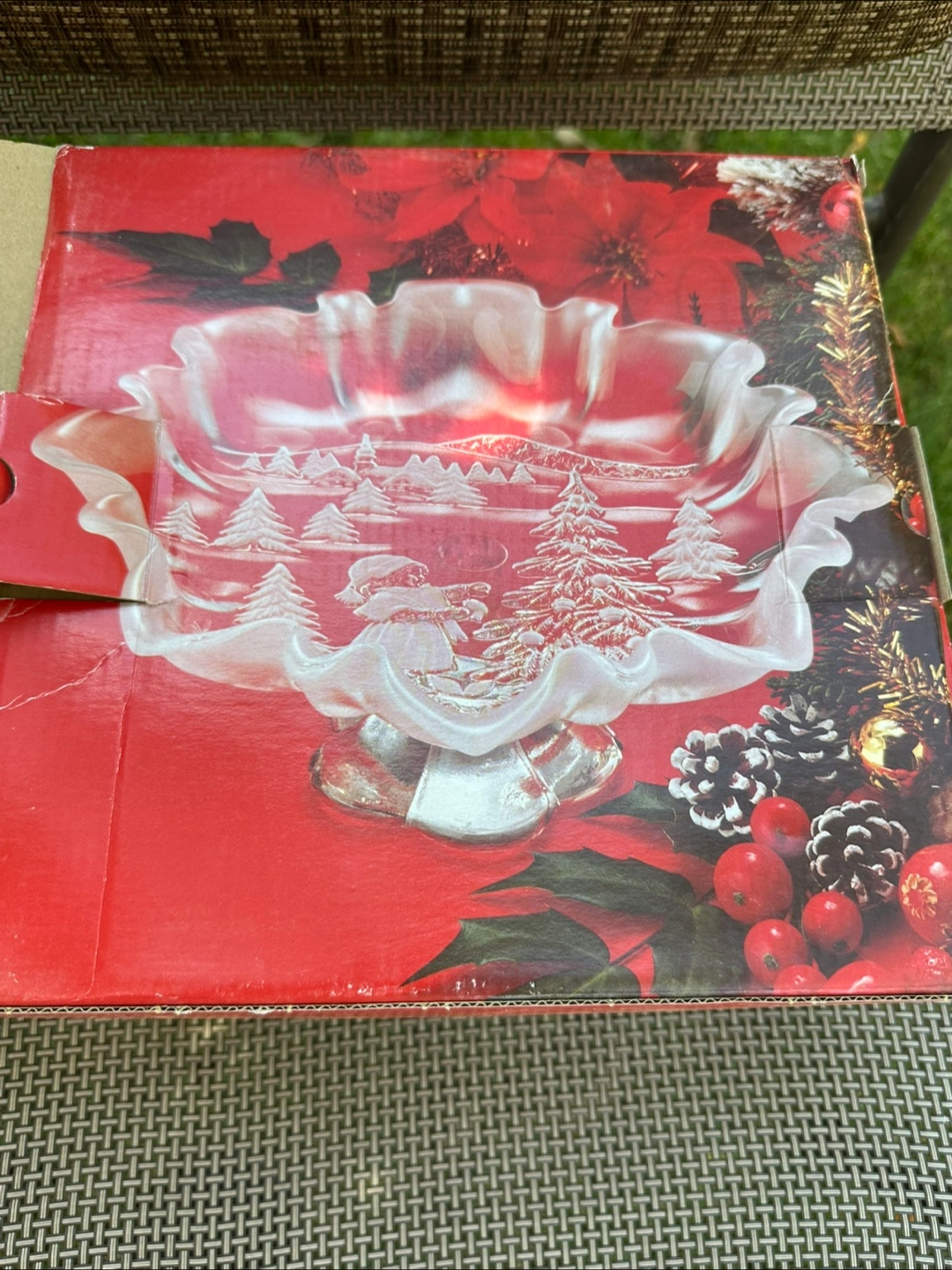 Selling a beautiful Mikasa Christmas Story footed bon bon dish! It's 9 3/4" in size and comes with the original box. Perfect for adding a touch of festive charm to your home this holiday season