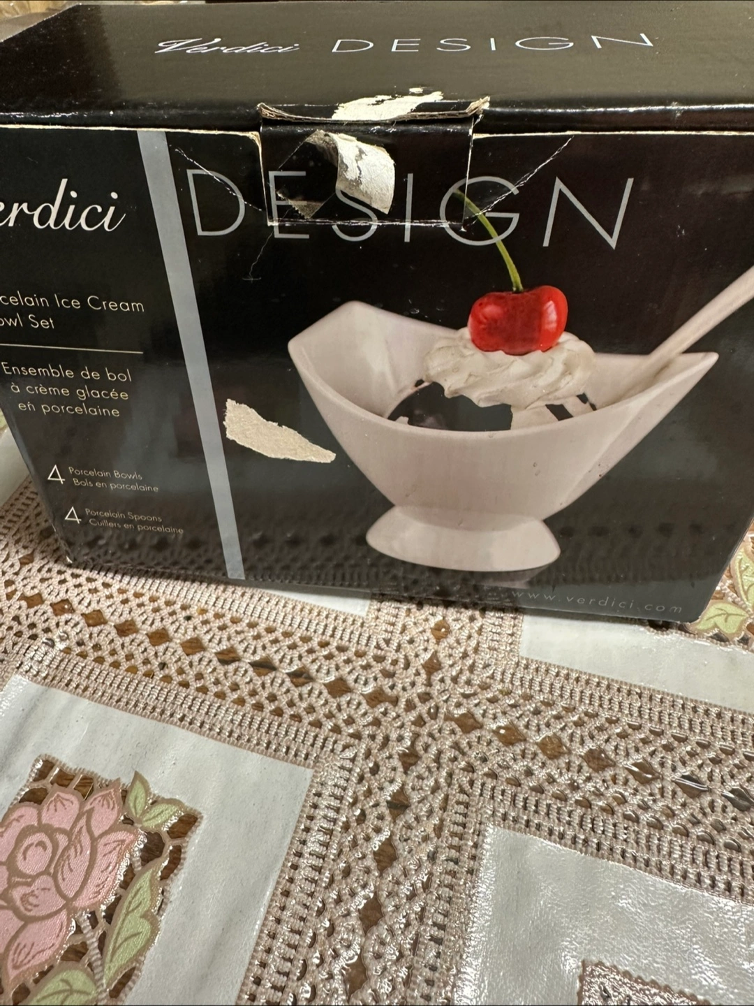 Selling a Verdici Design porcelain ice cream bowl set. It includes 4 porcelain bowls and 4 porcelain spoons! Perfect for serving up your favourite frozen treats