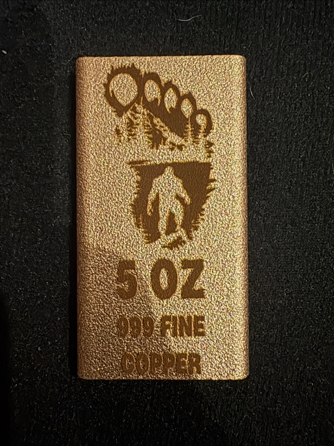 Selling a 5 OZ .999 fine copper bar. It features a unique design with a sasquatch and footprint. A great piece for any collector!