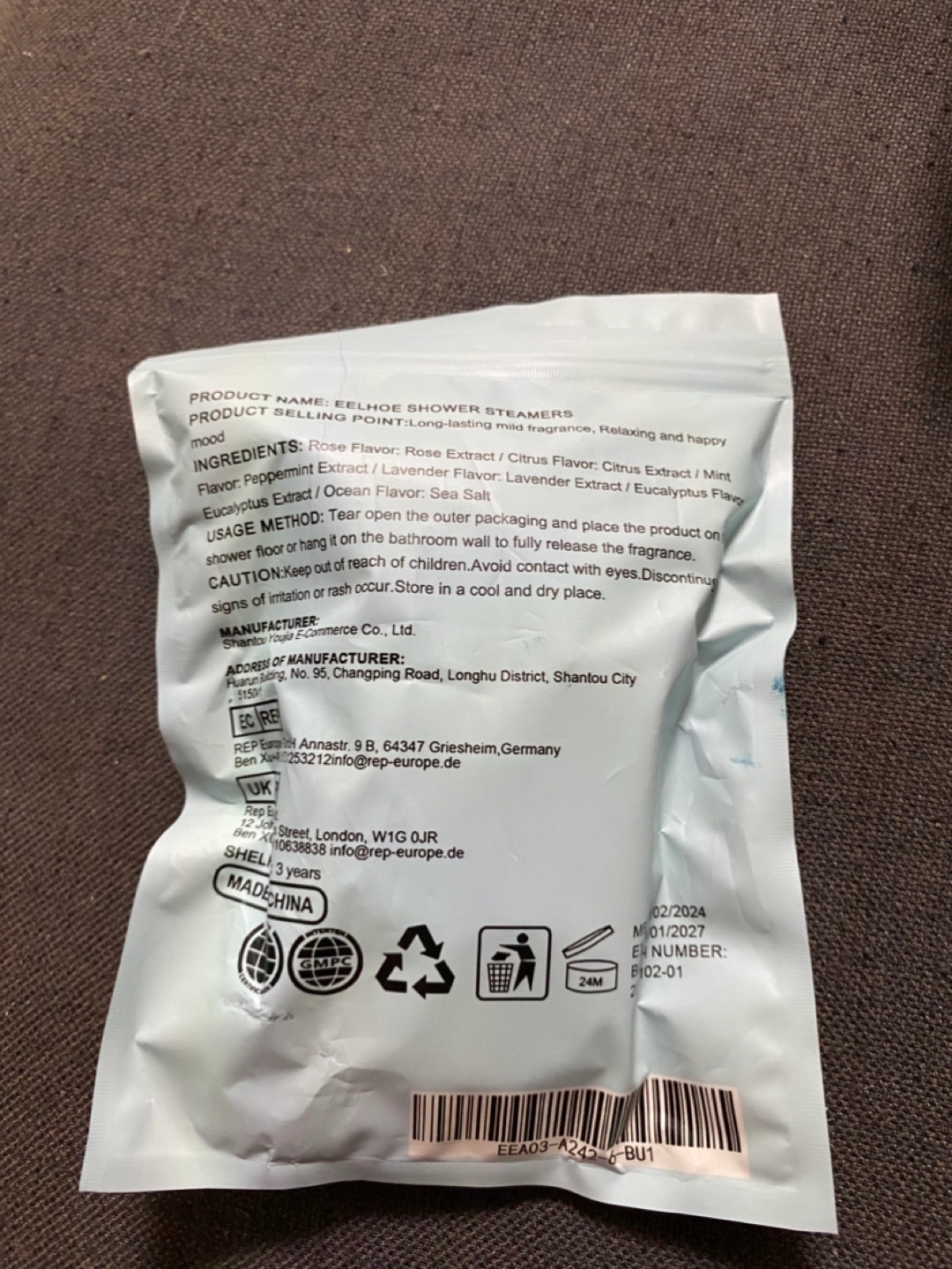Treat yourself to a spa-like experience at home with these Eelhoe Nature Scented Shower Steamers! This pack includes 6 individual steamers, perfect for refreshing, relaxing, and recharging after a long day. Enjoy the long-lasting, mild fragrance that creates a relaxing and happy mood. The scents include Rose, Peppermint, Lavender, Citrus, Mint, Eucalyptus, and Ocean Sea Salt. Expiry date is February 2027