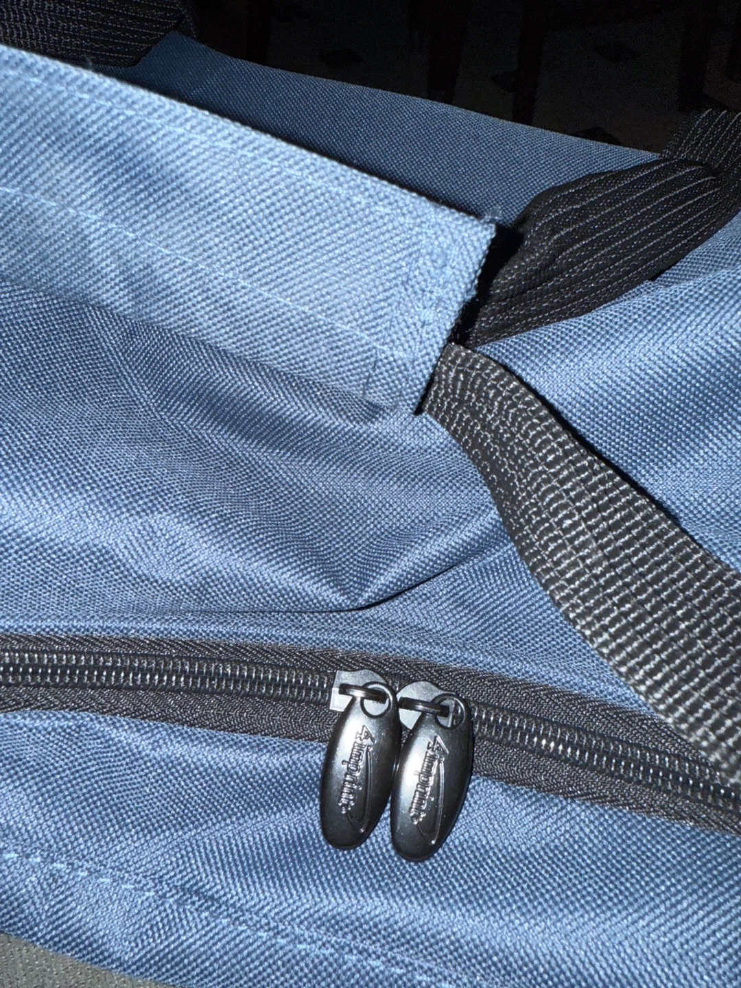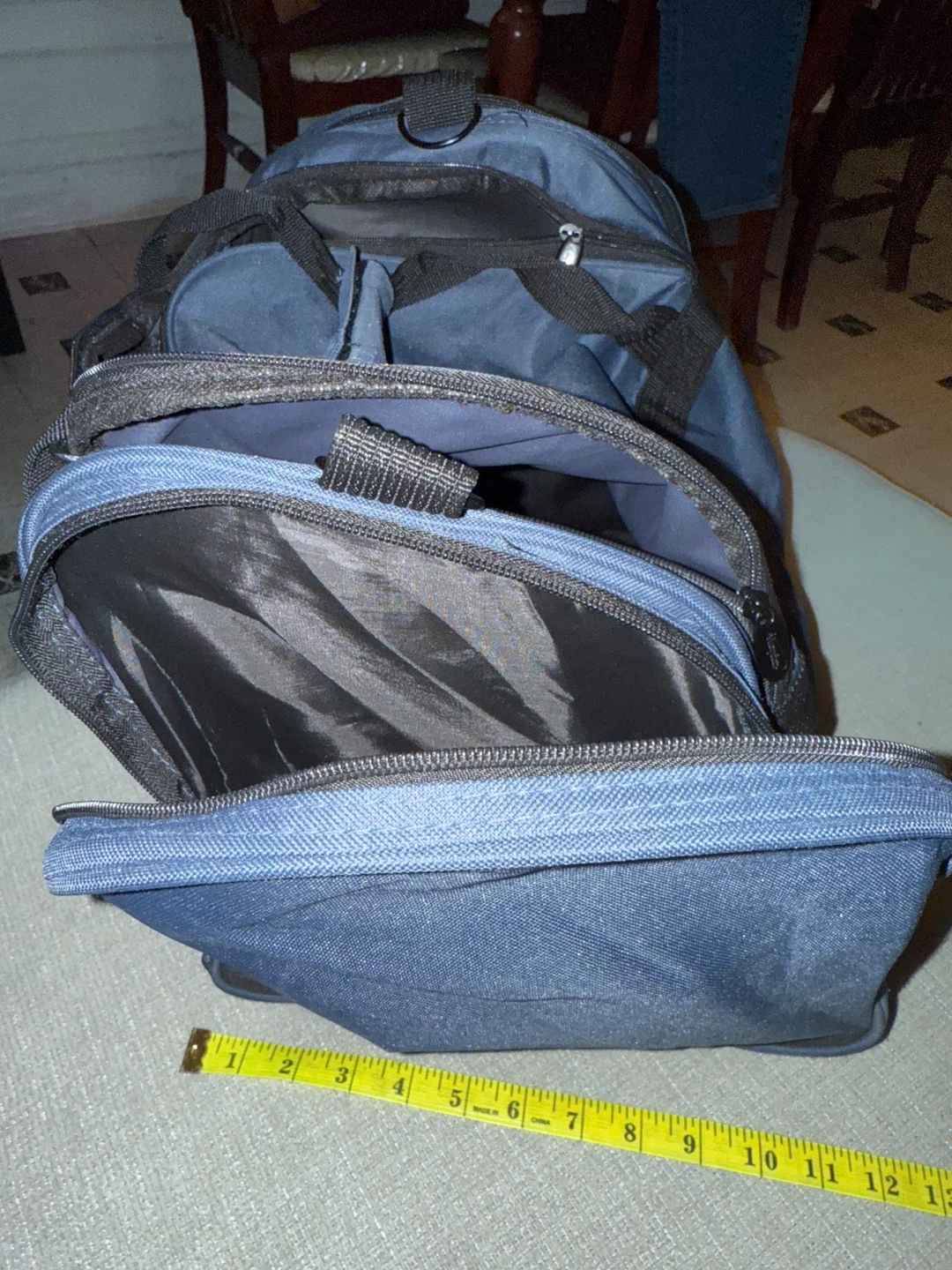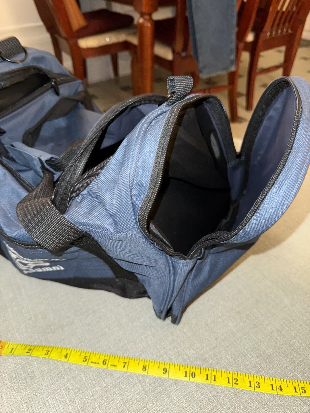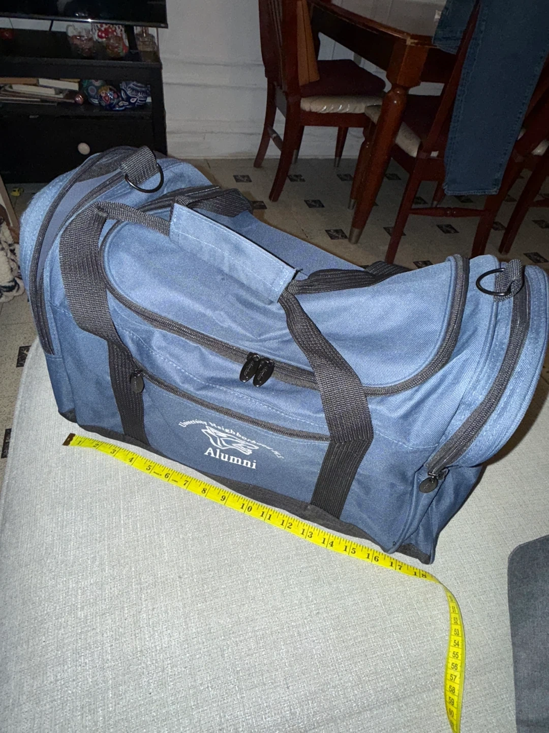This is a blue duffel bag with 'Alumni' and a school logo printed on it. It's made of durable fabric with multiple zippered compartments. Measures approximately 18 inches long. π»It does not have a crossbody strapπ» smoke-free home. Pick up/cash only