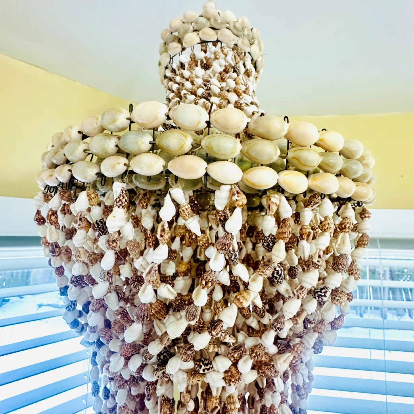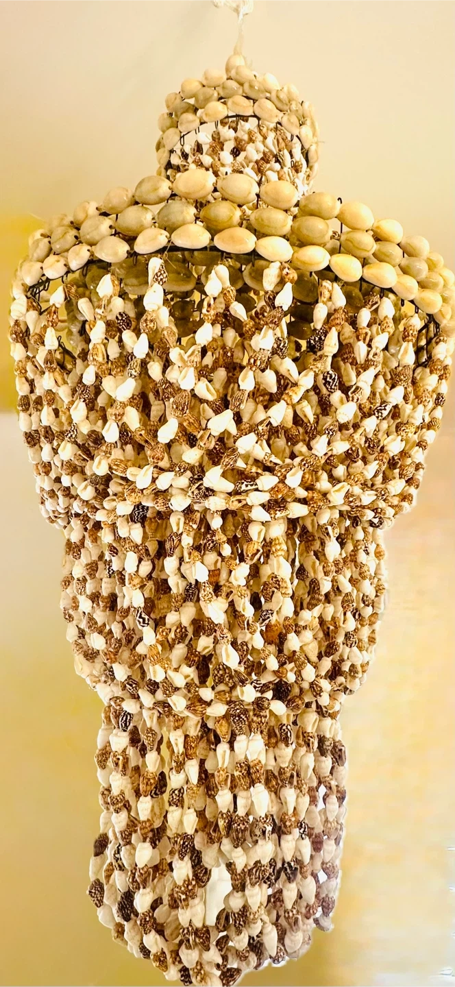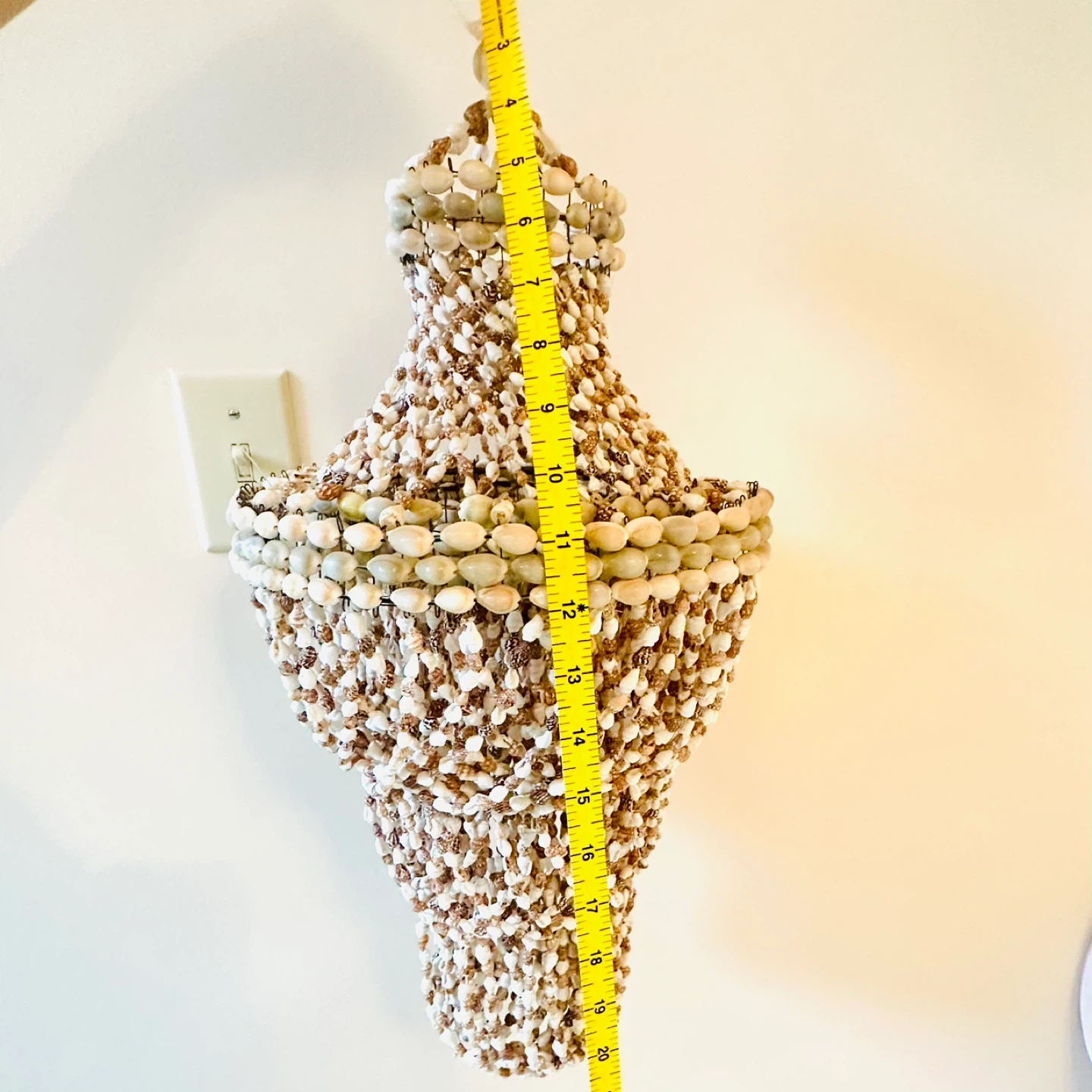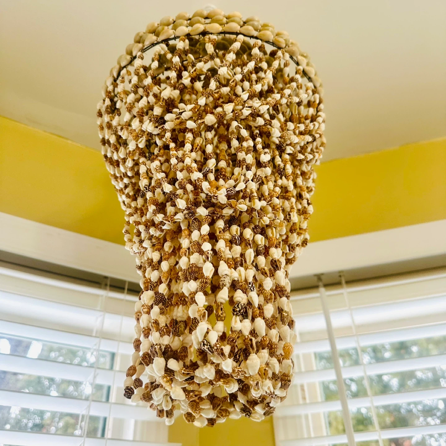 A unique seashell chandelier, perfect for adding a coastal vibe to any room. It's adorned with numerous small shells of varying colours and patterns, creating a textured and eye-catching piece. This decorative fixture would be a lovely addition to a beach-themed or eclectic home decor scheme.
