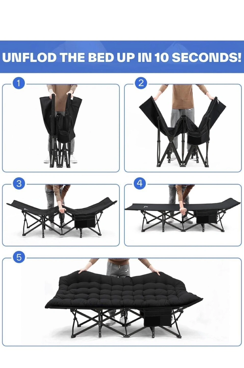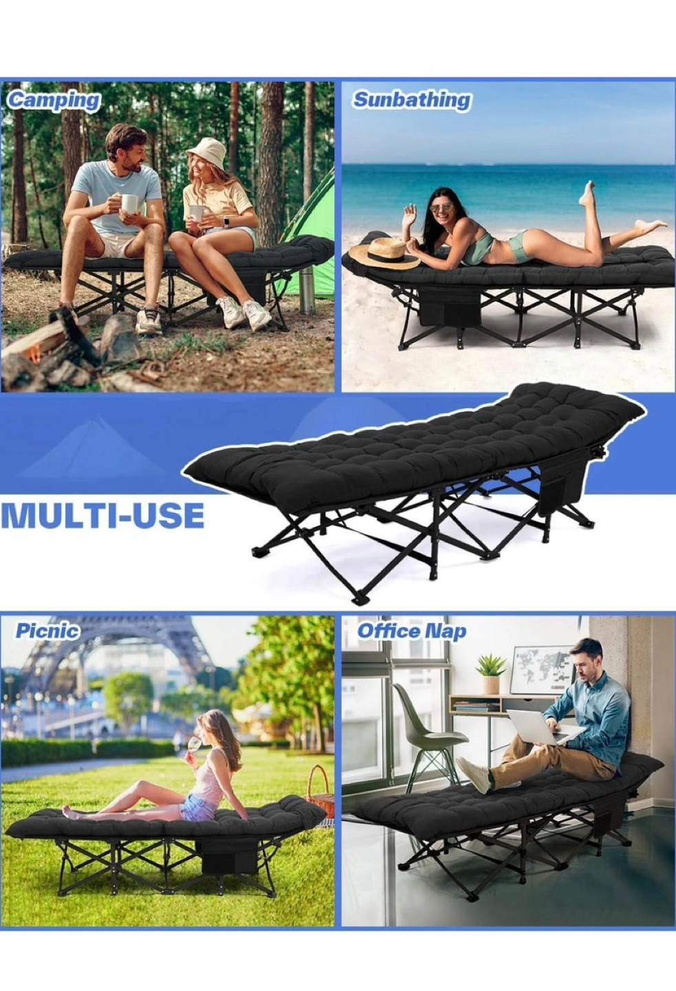 It's multi-use, perfect for camping, sunbathing, picnics, or even an office nap. The cot is black and includes a side pocket for storing essentials