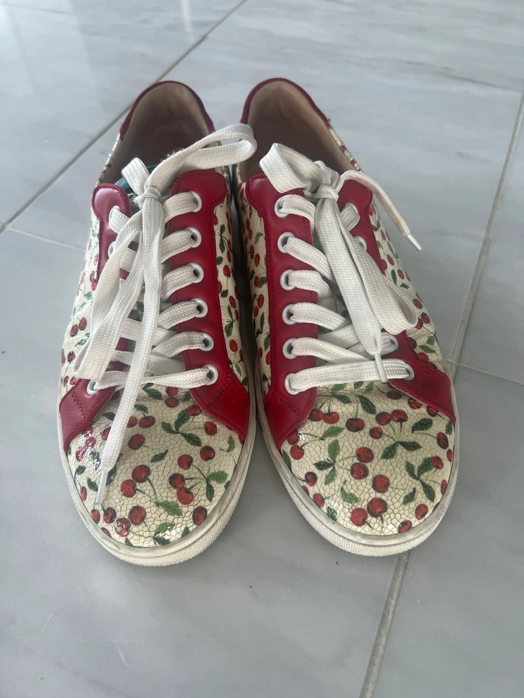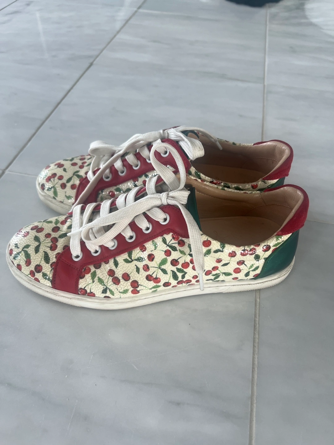 These Christian Louboutin sneakers feature a fun cherry print design! They're in great condition and ready for a new home. The red accents add a pop of colour to any outfit. Perfect for adding a playful touch to your everyday style