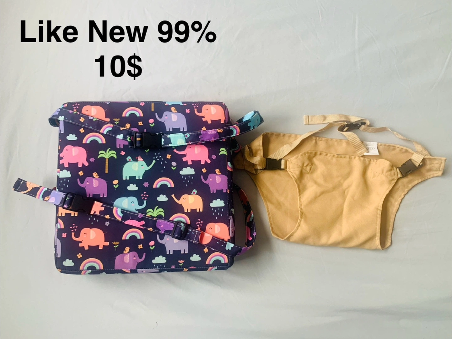 Selling a baby dining chair cushion and dining chair strap in almost NEW condition! The cushion features a cute elephant pattern. This set is perfect for making meal times easier and more comfortable for your little one.