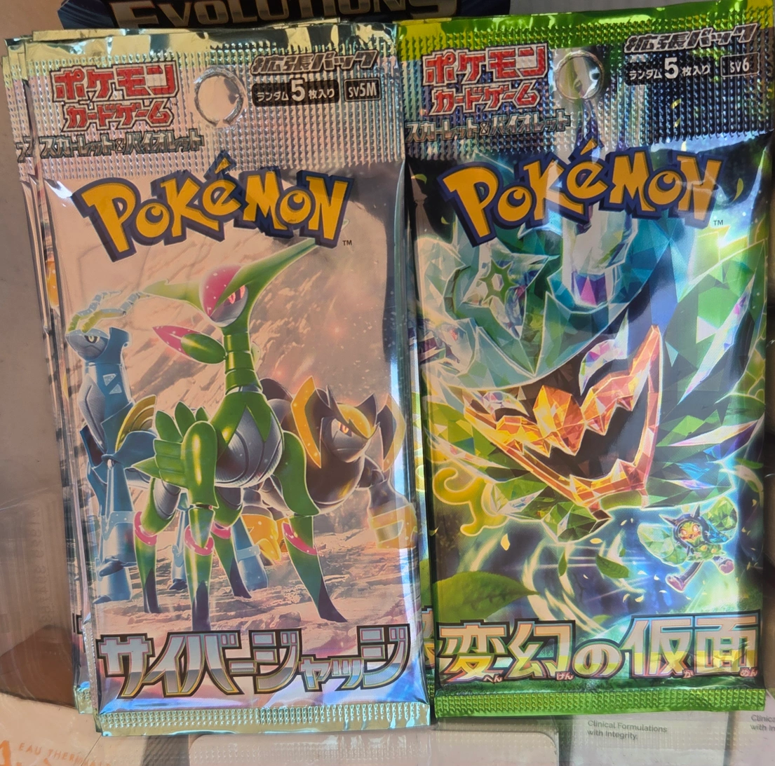 Selling two Pokémon card game booster packs! One is from the Scarlet & Violet series (SV5M), called Cyber Judge (サイバージャージ). The other is from the Scarlet & Violet series (SV6), called Henkan no Kamen (変幻の仮面). Both packs contain 5 random cards!
