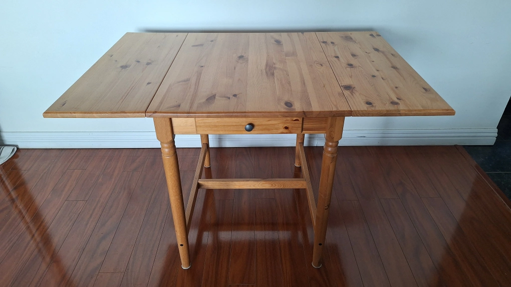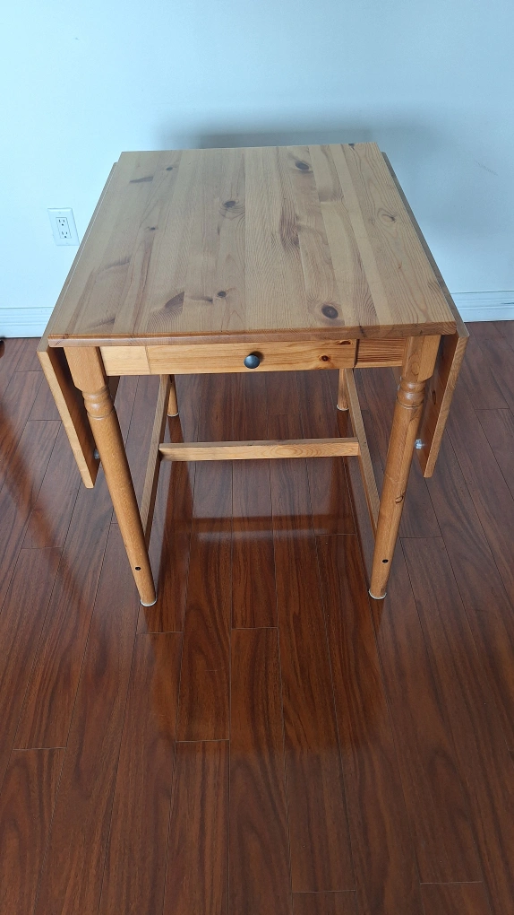 Beautiful and versatile drop-leaf table, perfect for small spaces! Use it fully extended for dining or fold down the leaves to save space. Ideal for apartments, condos, or as an extra table when guests come over.