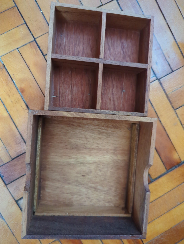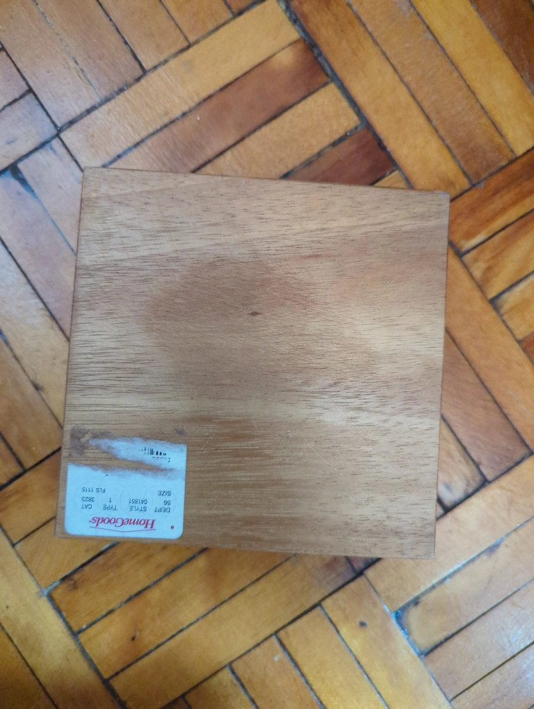 I'm selling a wooden box from HomeGoods! It comes with a lid and has a nice, natural wood finish. It's perfect for storing small items or organizing your space. It has a four-compartment tray that fits inside the box.