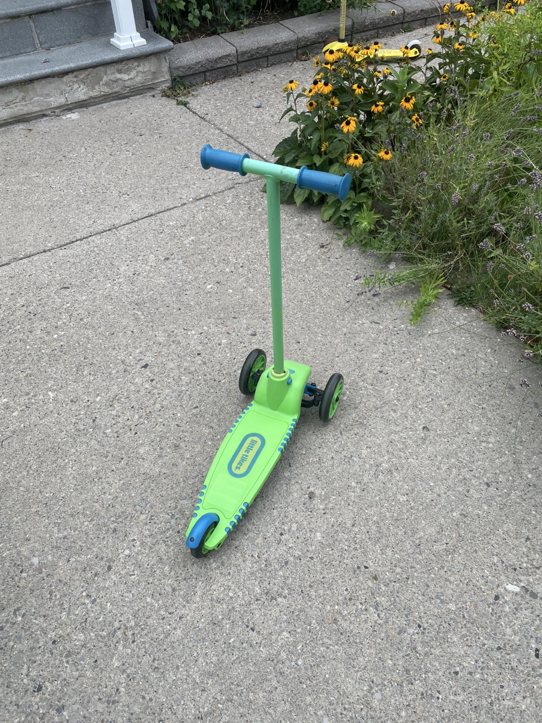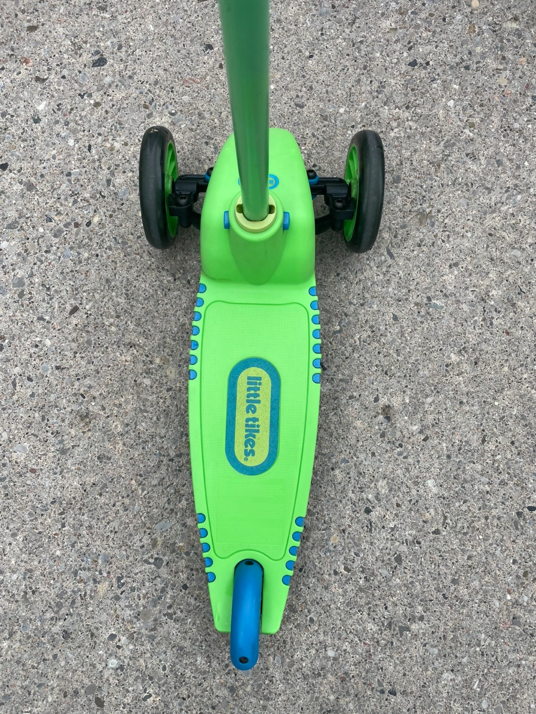 Selling a Little Tikes scooter in great condition! It's a fun green and blue colour. Perfect for little ones learning to scoot around the neighbourhood or park. It's lightweight and easy to carry too!