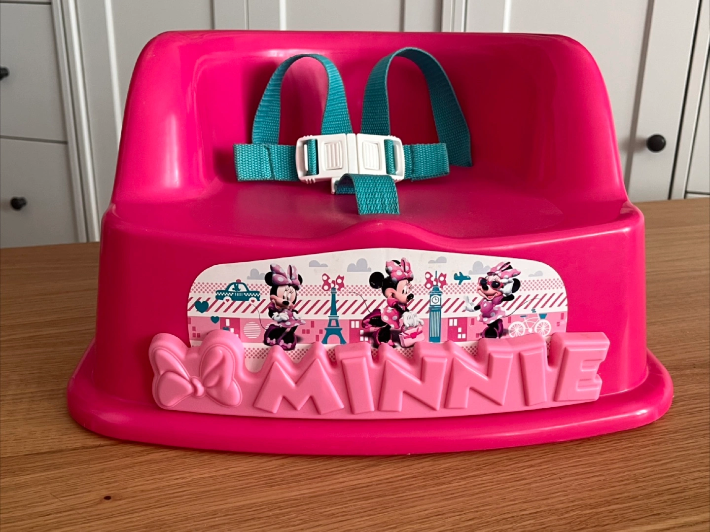 Here's a cute pink Minnie Mouse booster seat for your little one! It's in great shape and ready for a new home. Perfect for toddlers who are learning to sit up at the table