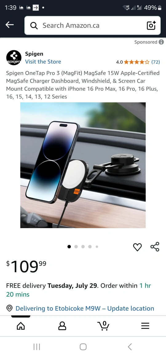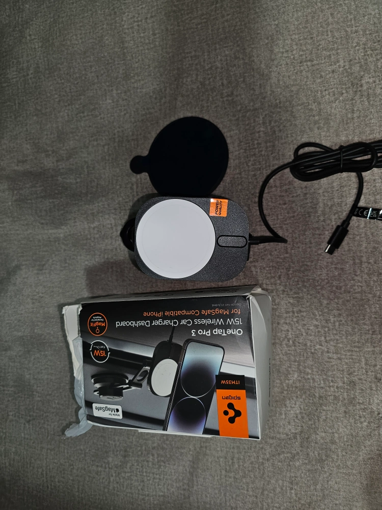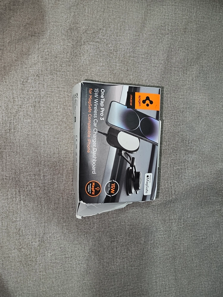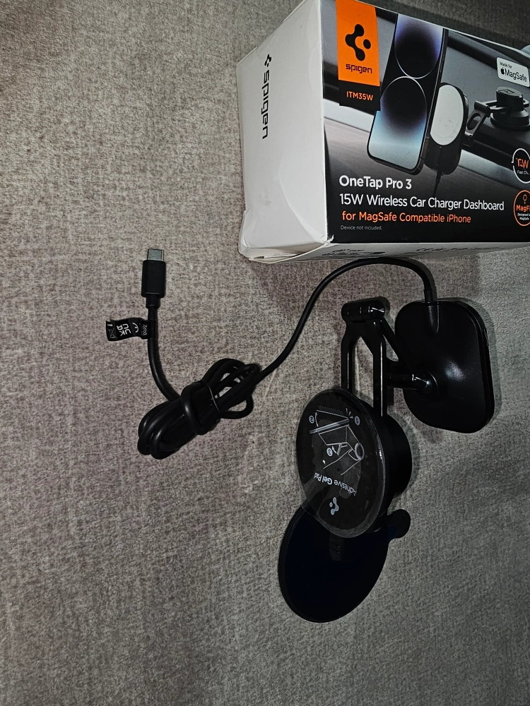 118Never used-open box only Selling a Spigen OneTap Pro 3 15W wireless car charger dashboard mount for MagSafe compatible iPhones It comes with: - Charger - Box Originally price $109.99