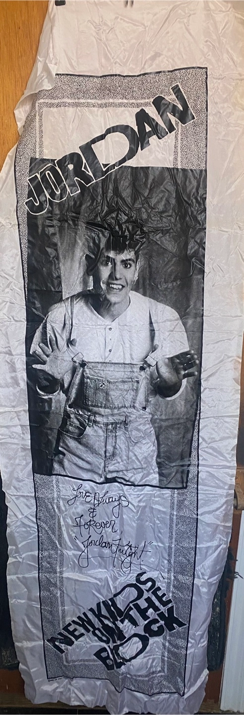 Own a piece of pop culture history with this vintage New Kids on the Block Jordan Knight satin poster flag from 1991! This unique collectible features a black and white image of Jordan, complete with his autograph printed on.