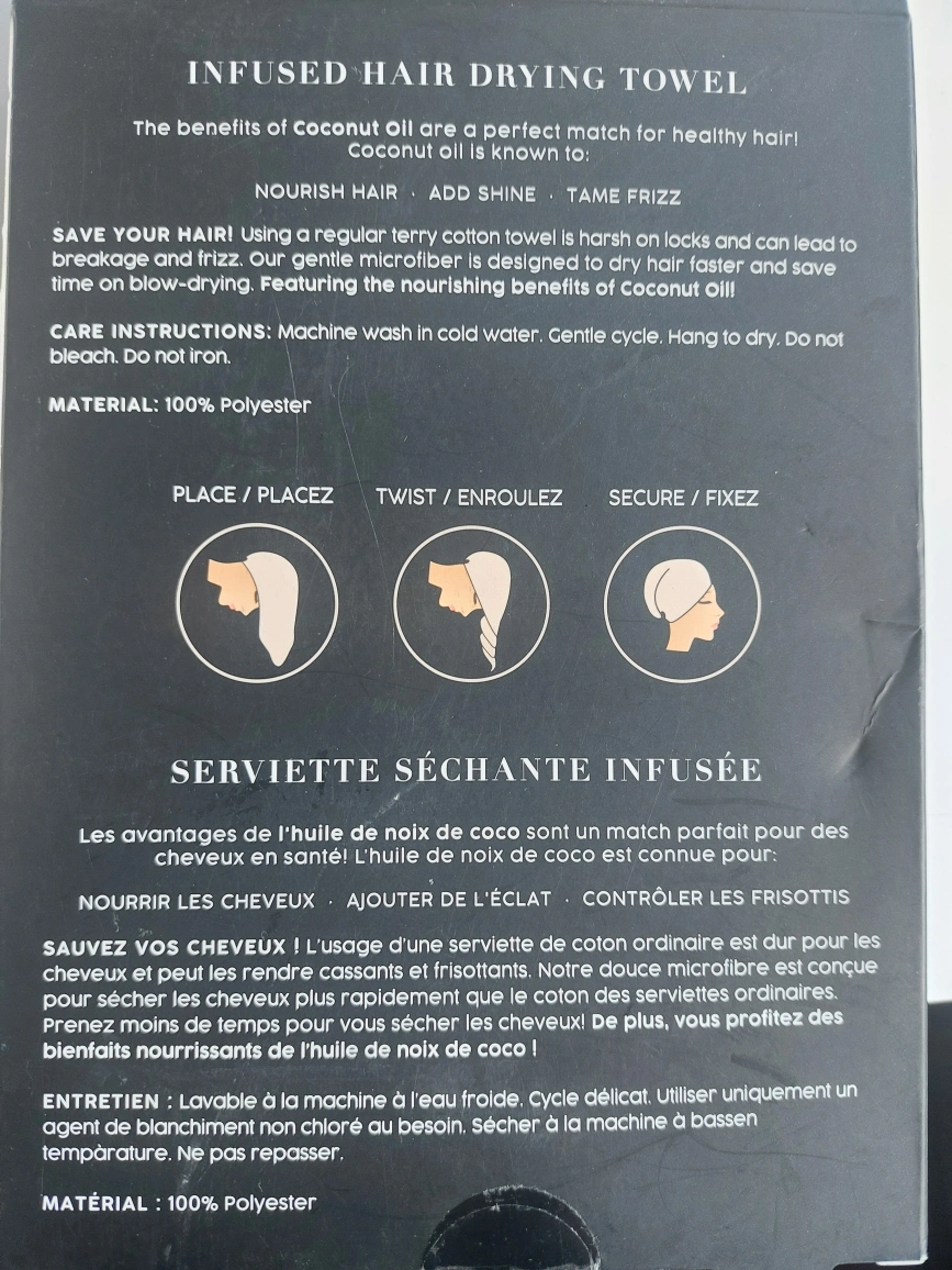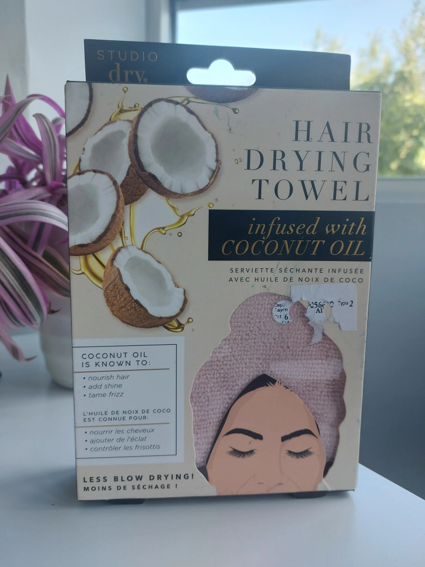 Got a Studio Dry hair drying towel infused with coconut oil as a gift, but I already have a similar one. It's designed to dry hair faster while nourishing it with coconut oil. Less blow drying!