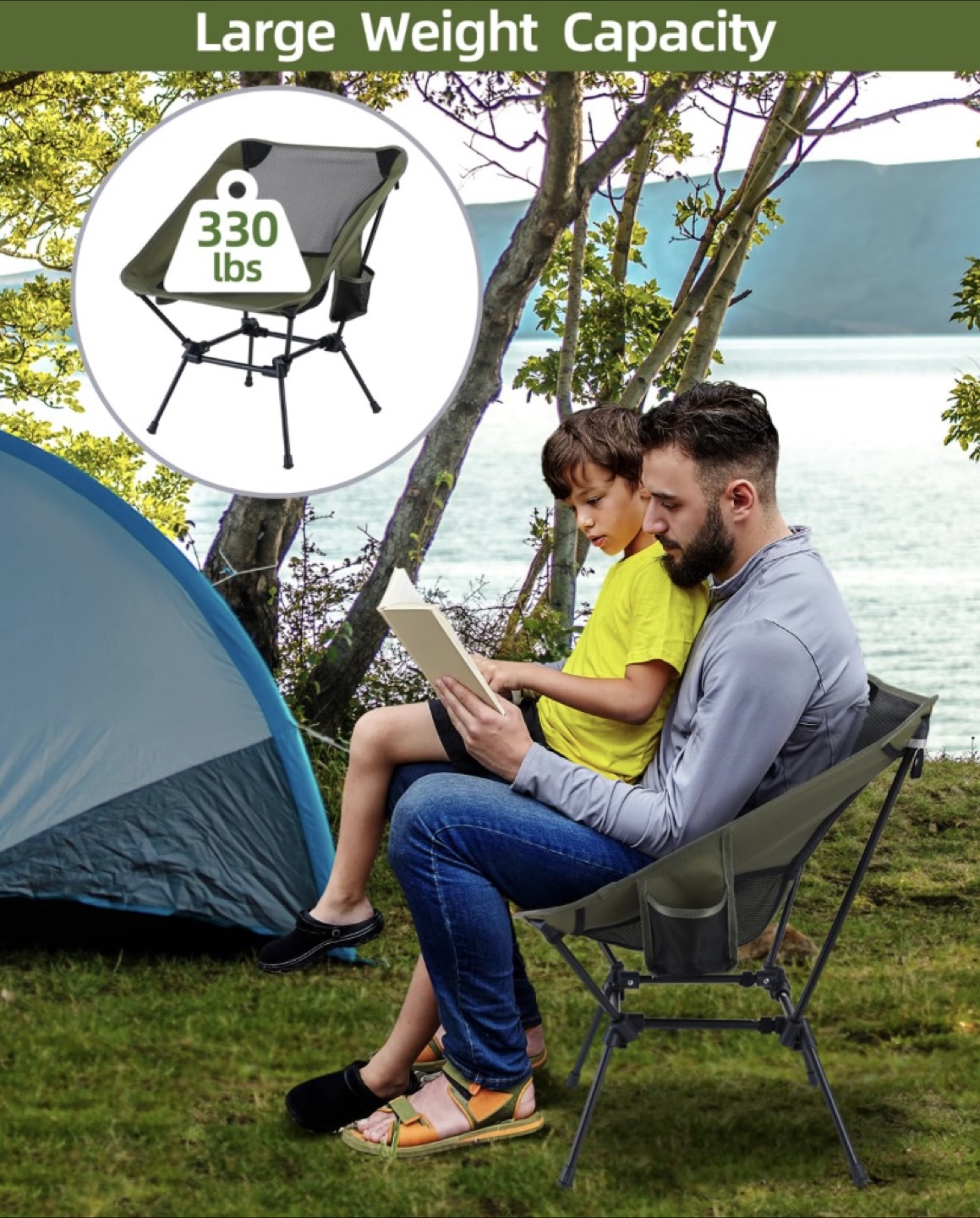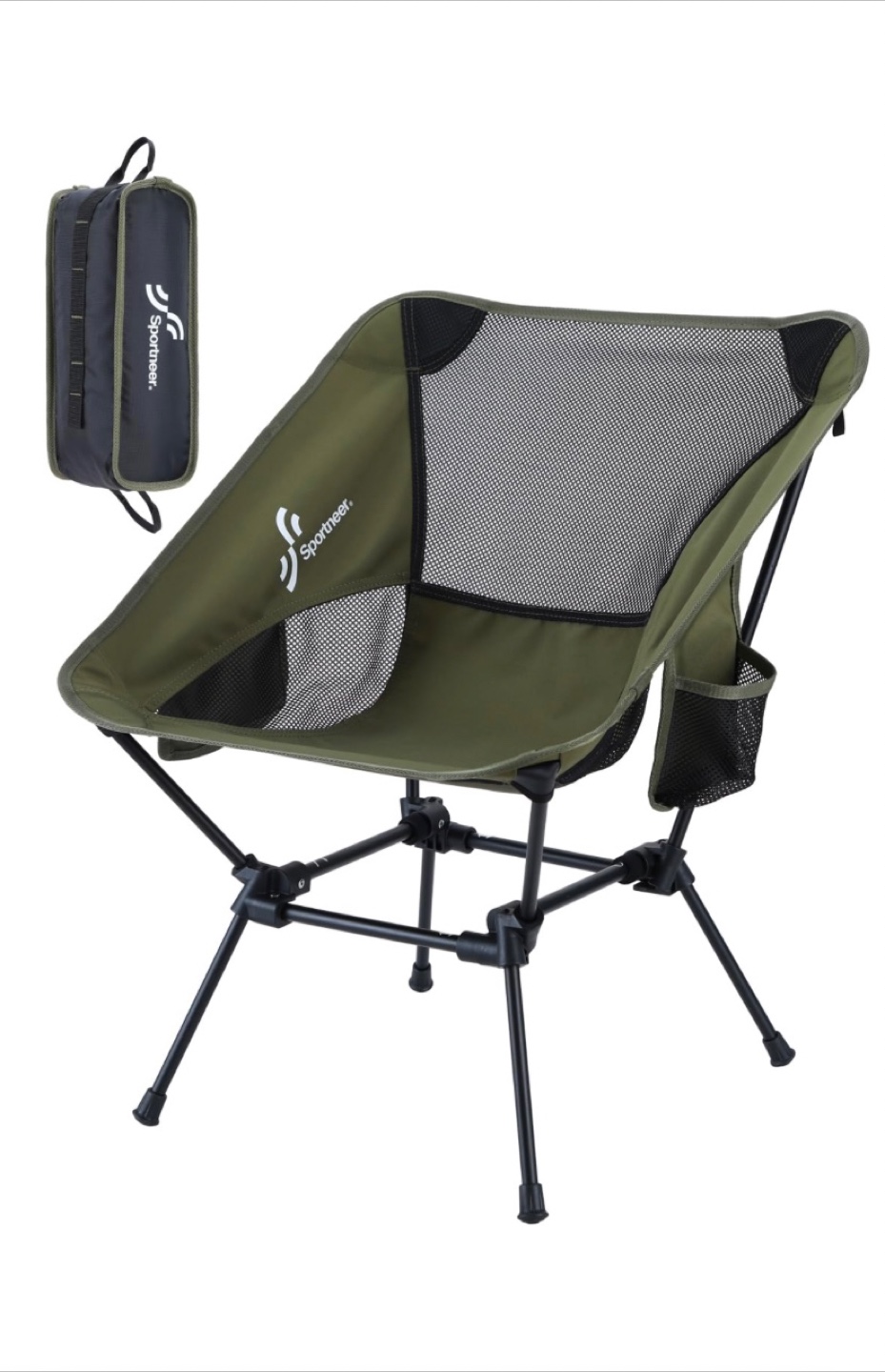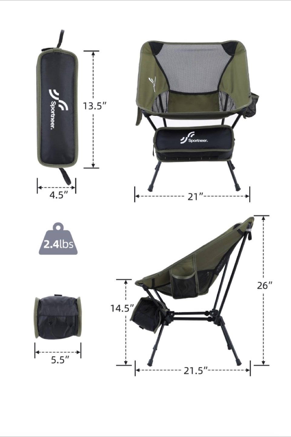 This Sportneer camping chair is perfect! It's lightweight, weighing only 2.4 lbs, and can hold up to 330 lbs. It also has two side pockets for your drinks or other essentials. Dimensions are approximately 21" x 21.5" x 26".