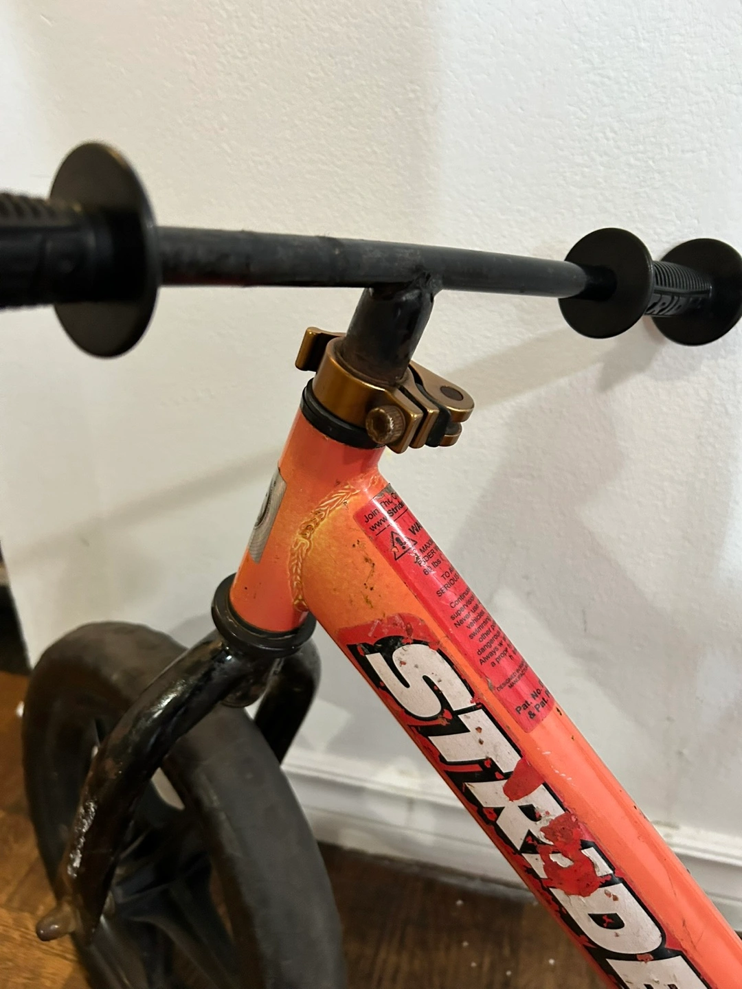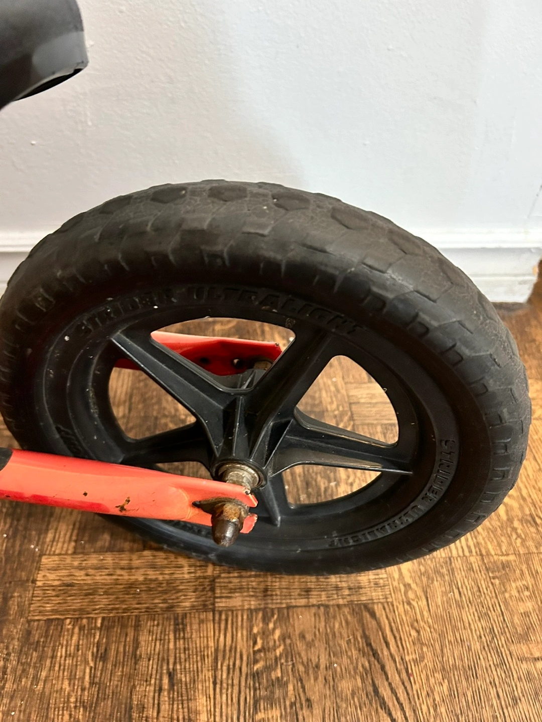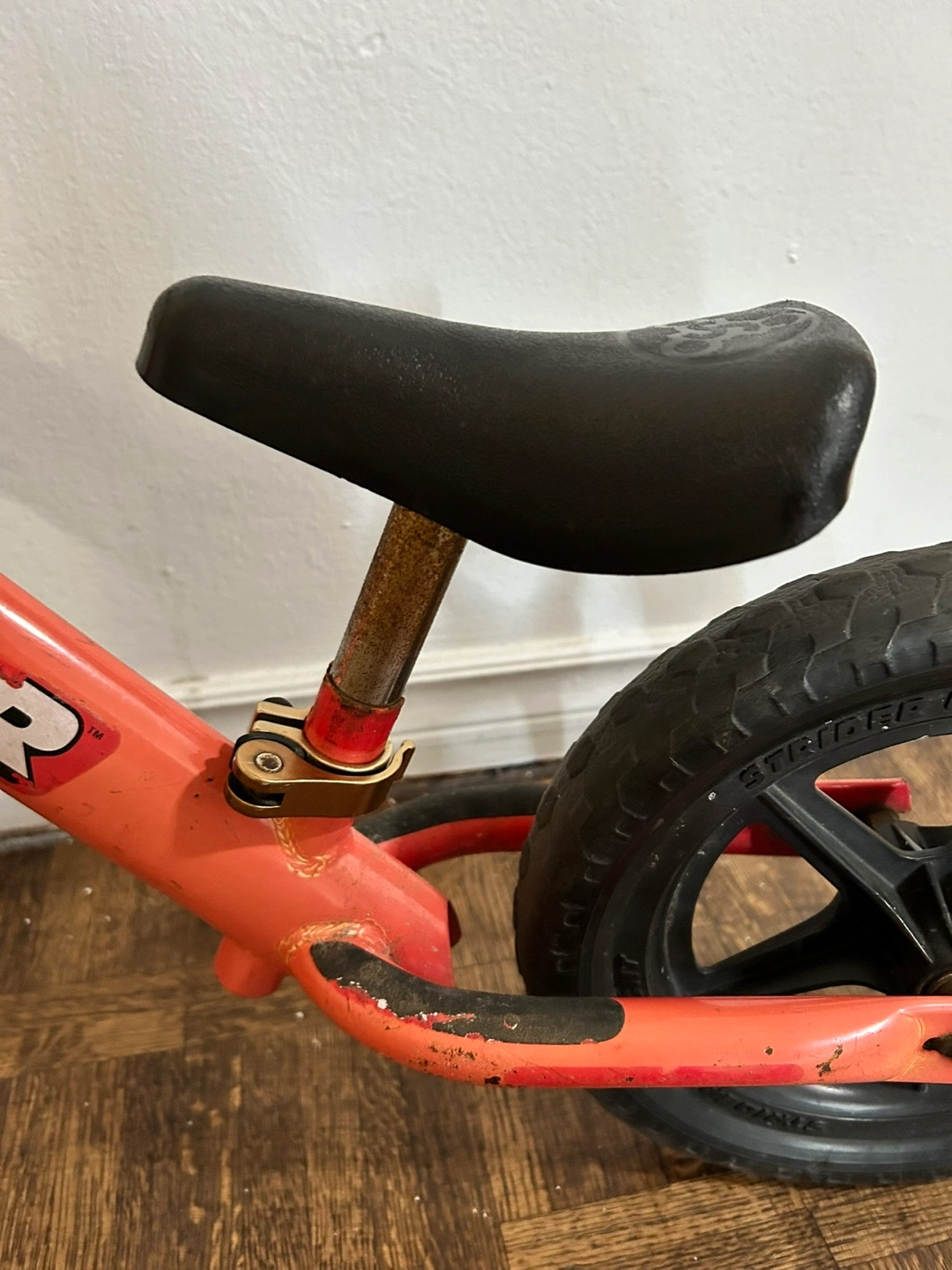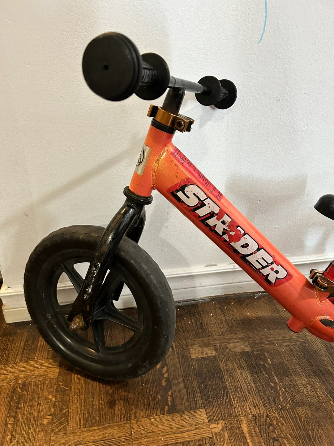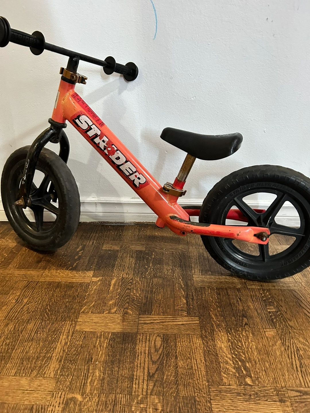 Selling a Strider balance bike, perfect for helping your little one learn to balance before transitioning to a pedal bike. It has some wear and tear, as you can see in the photos, but it's still in good working condition for lots of fun adventures!
