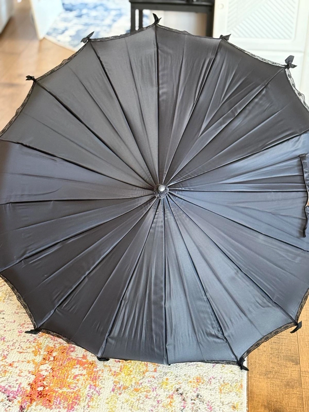 This is a beautiful black parasol umbrella featuring delicate lace trim. It adds a touch of elegance and style to any outfit or occasion. Perfect for sun protection or as a unique fashion statement!