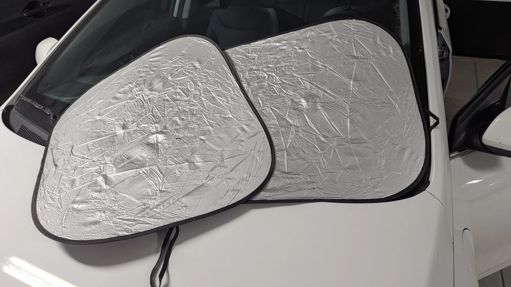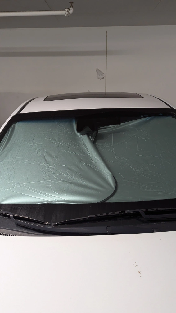 Keep your car cool with this sunshade! It's designed to fit most windshields and helps to block out the sun's rays. It also comes with a bag for easy storage when not in use.